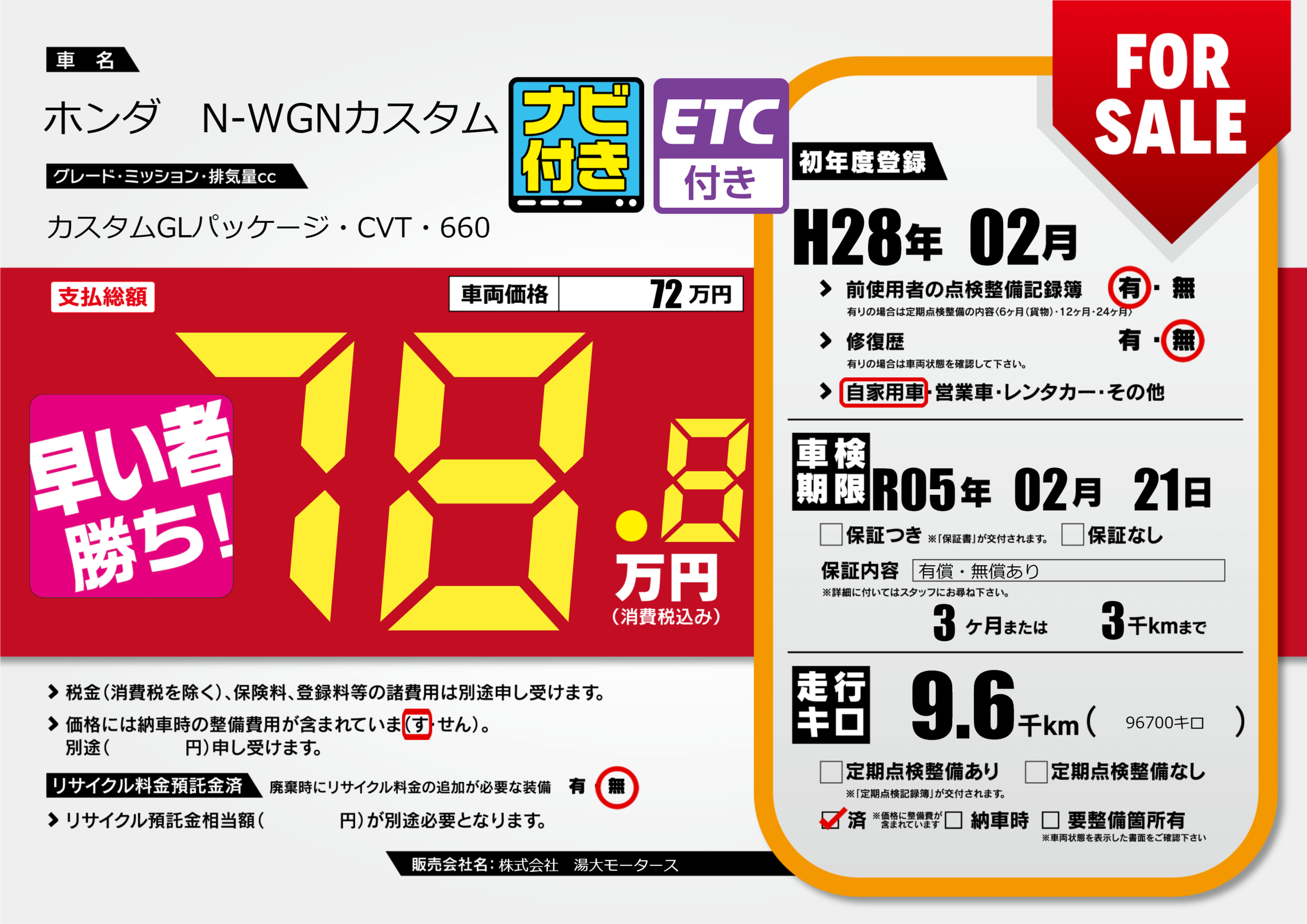 | 車名 | ホンダ N-WGNカスタム | グレード ミッション 排気量 |