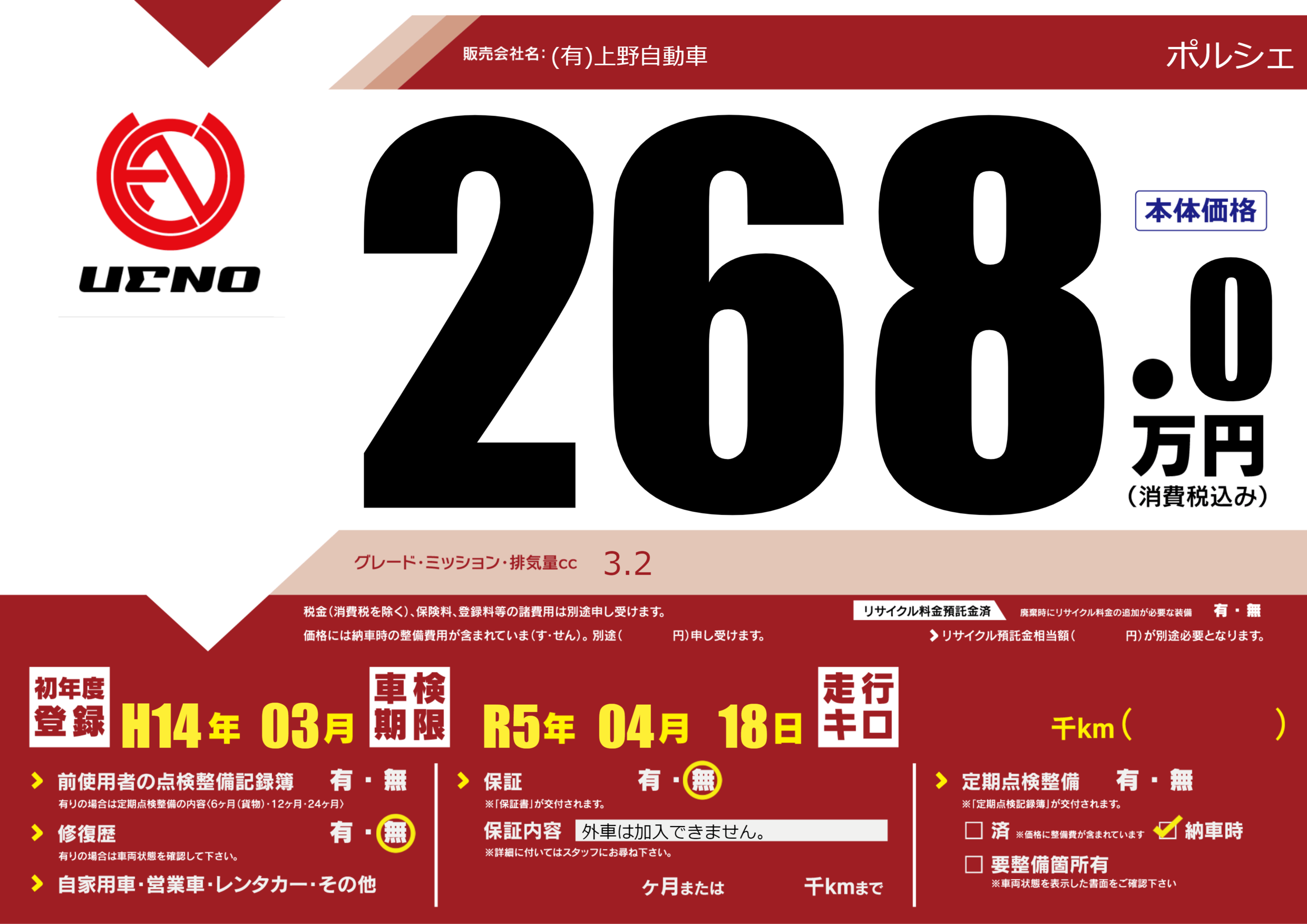 | 車名 | ポルシェ | グレード ミッション 排気量 |