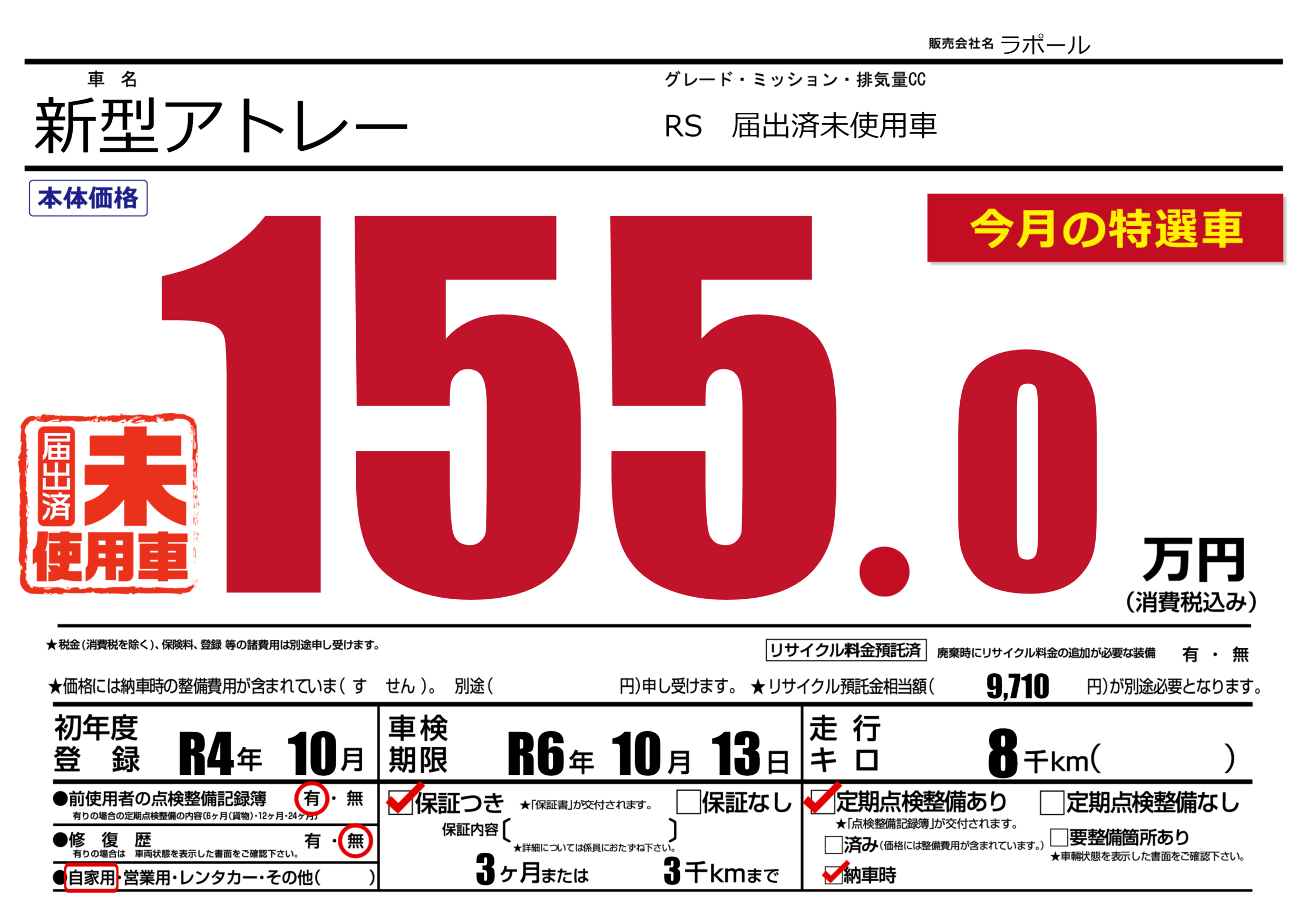 | 走行キロ | 0.8万km | 初年度登録 | R4年10月 |