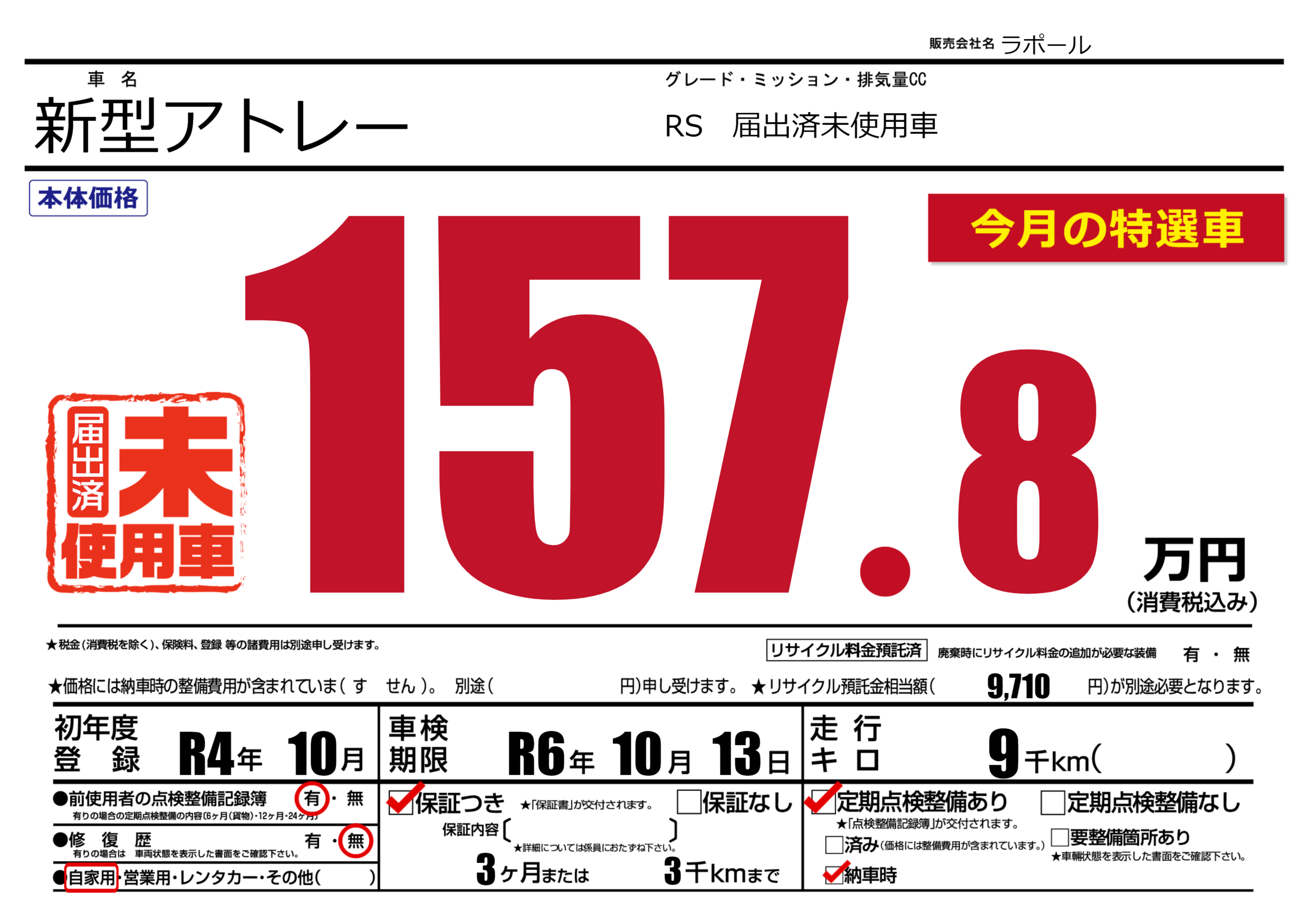 | 走行キロ | 0.9万km | 初年度登録 | R4年10月 |
