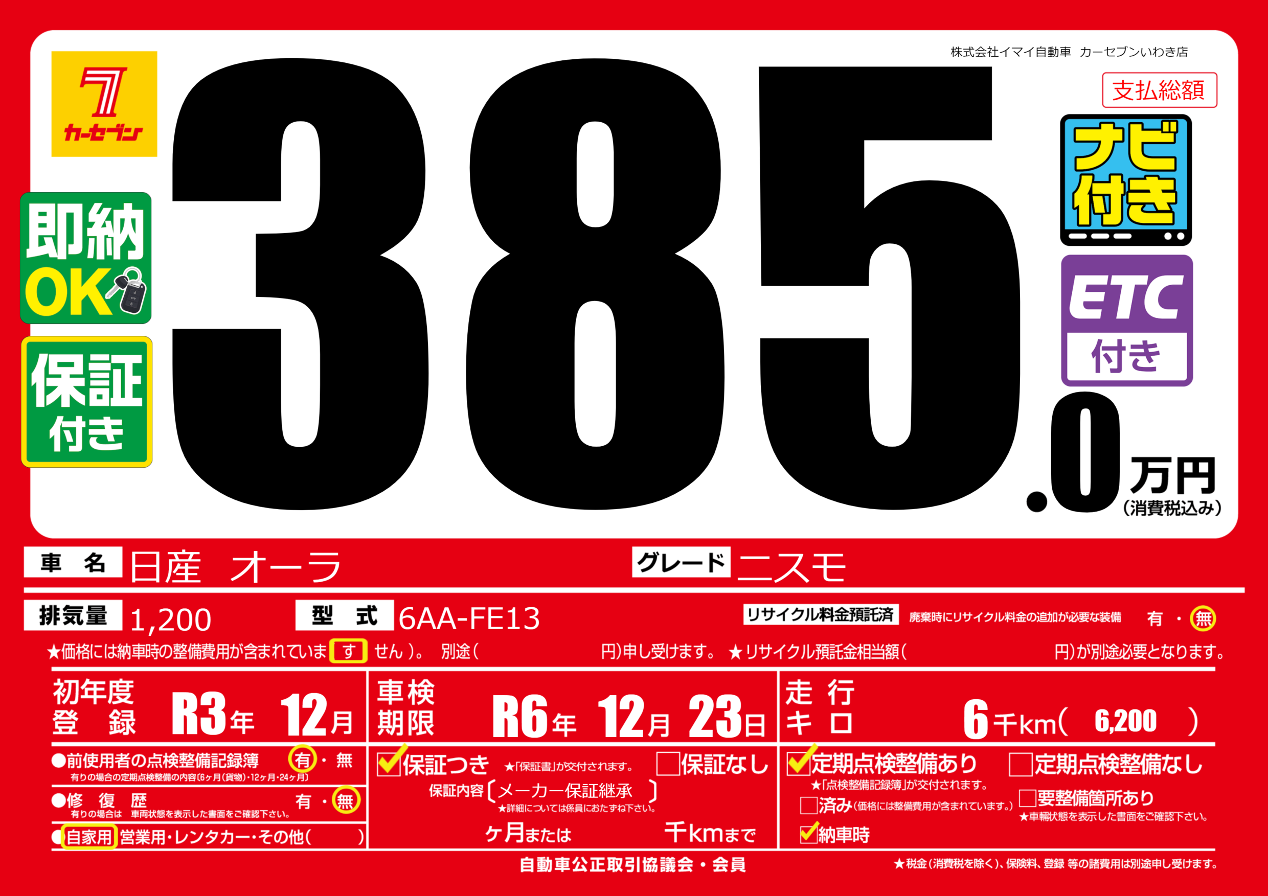 | 車名 | 日産 オーラ | グレード ミッション 排気量 |