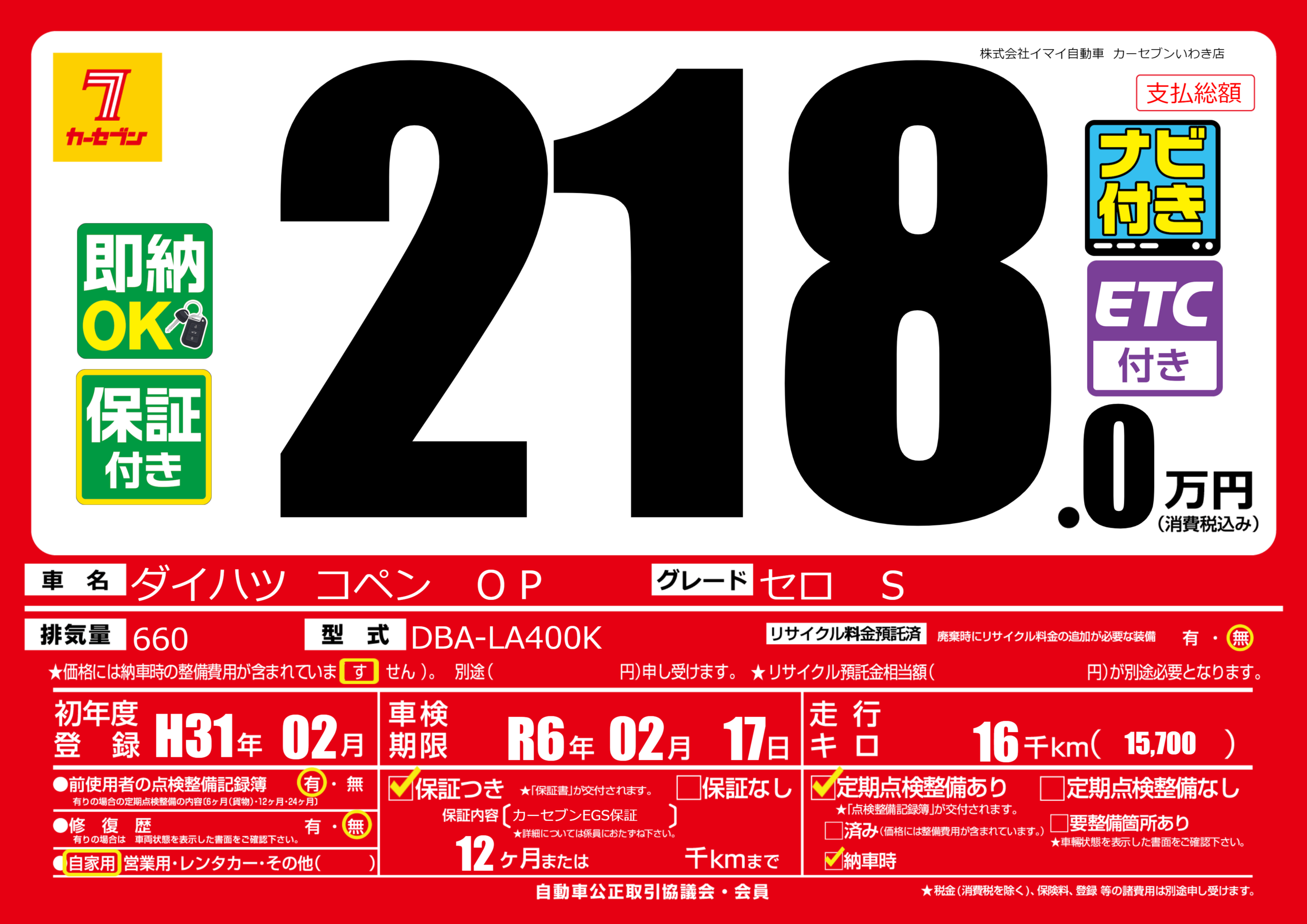 | 車名 | ダイハツ コペン OP | グレード ミッション 排気量 |