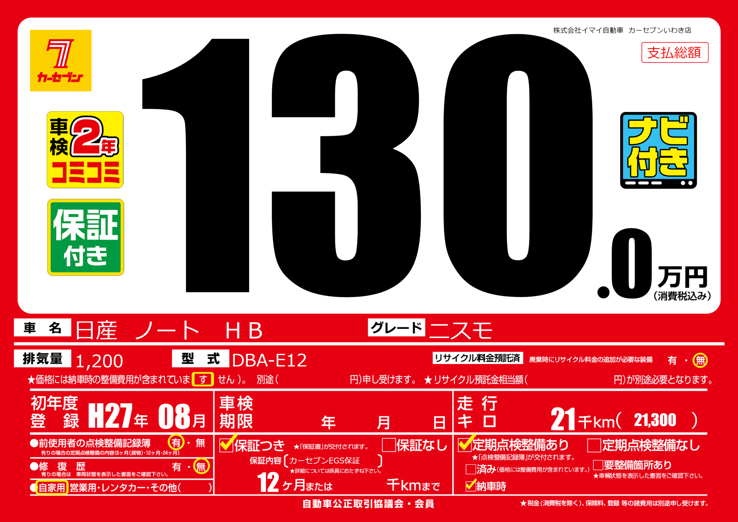 保証付き 保証内容(カーセブンEGS保証) 12ヶ月または千km |