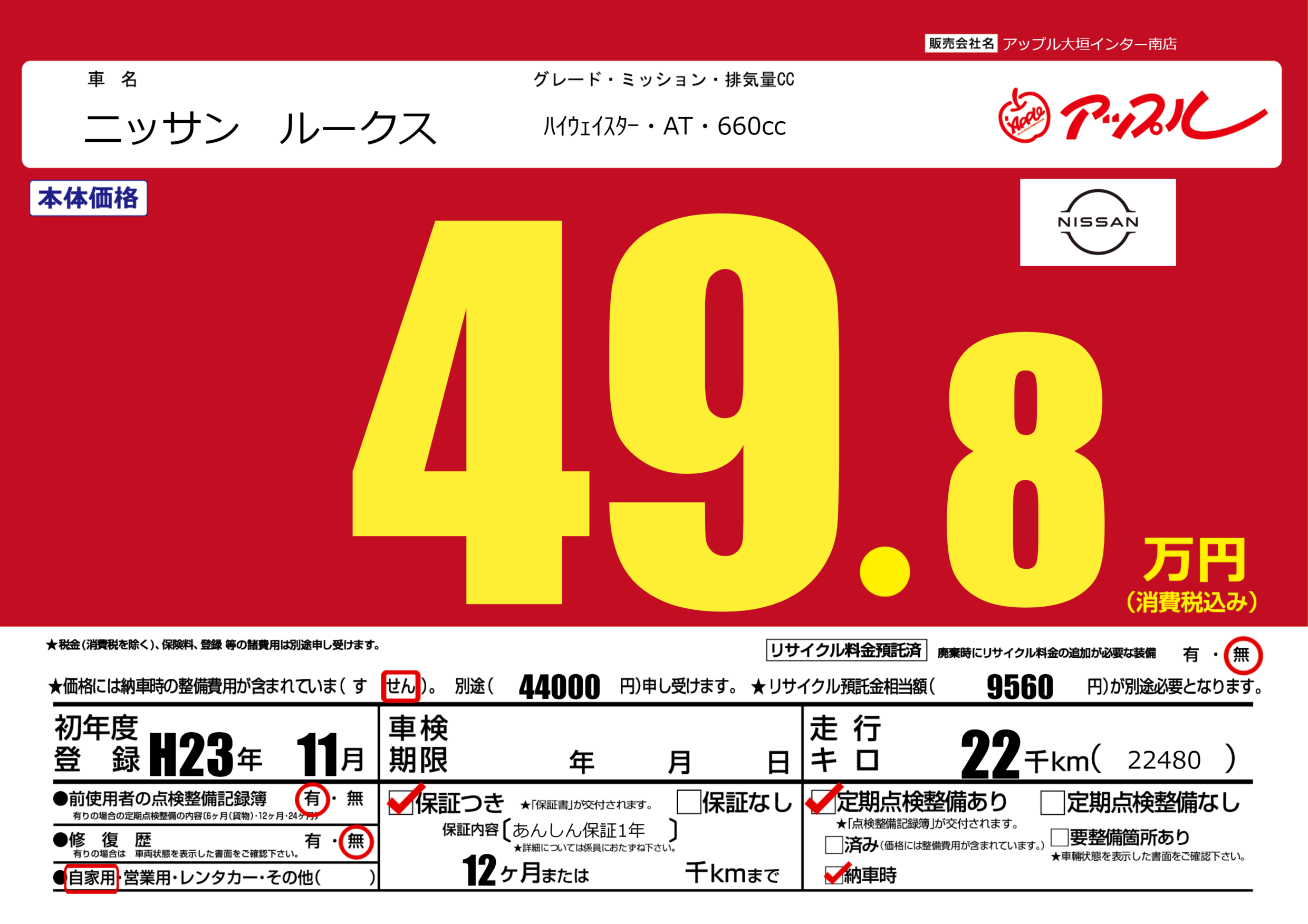 | 車名 | ニッサン ルークス | グレード ミッション 排気量 |