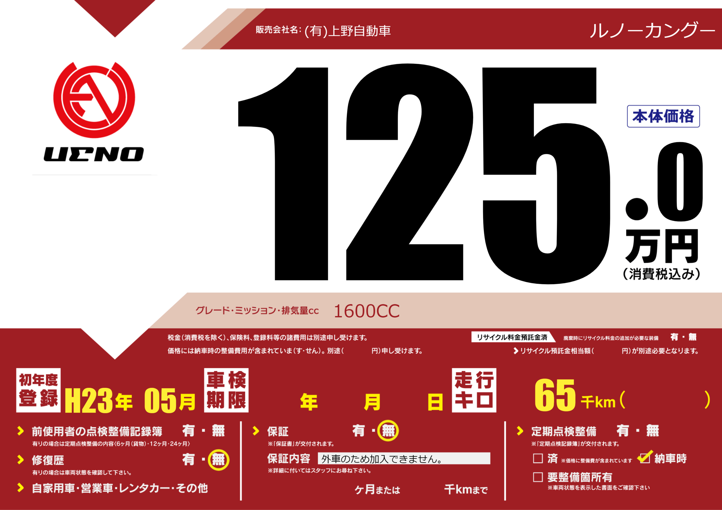 | 車名 | ルノーカングー | グレード ミッション 排気量 |