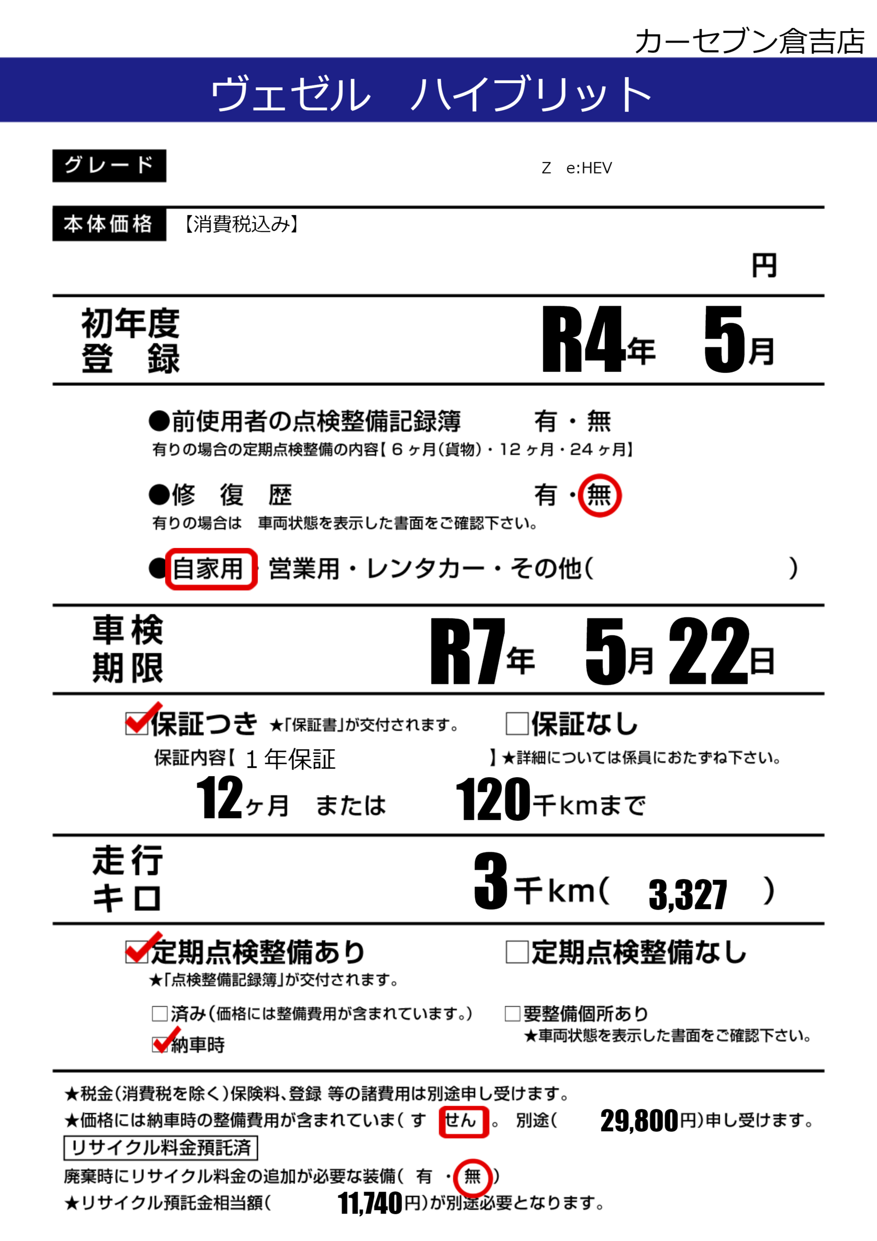 車検制限 | R7年5月22月 |