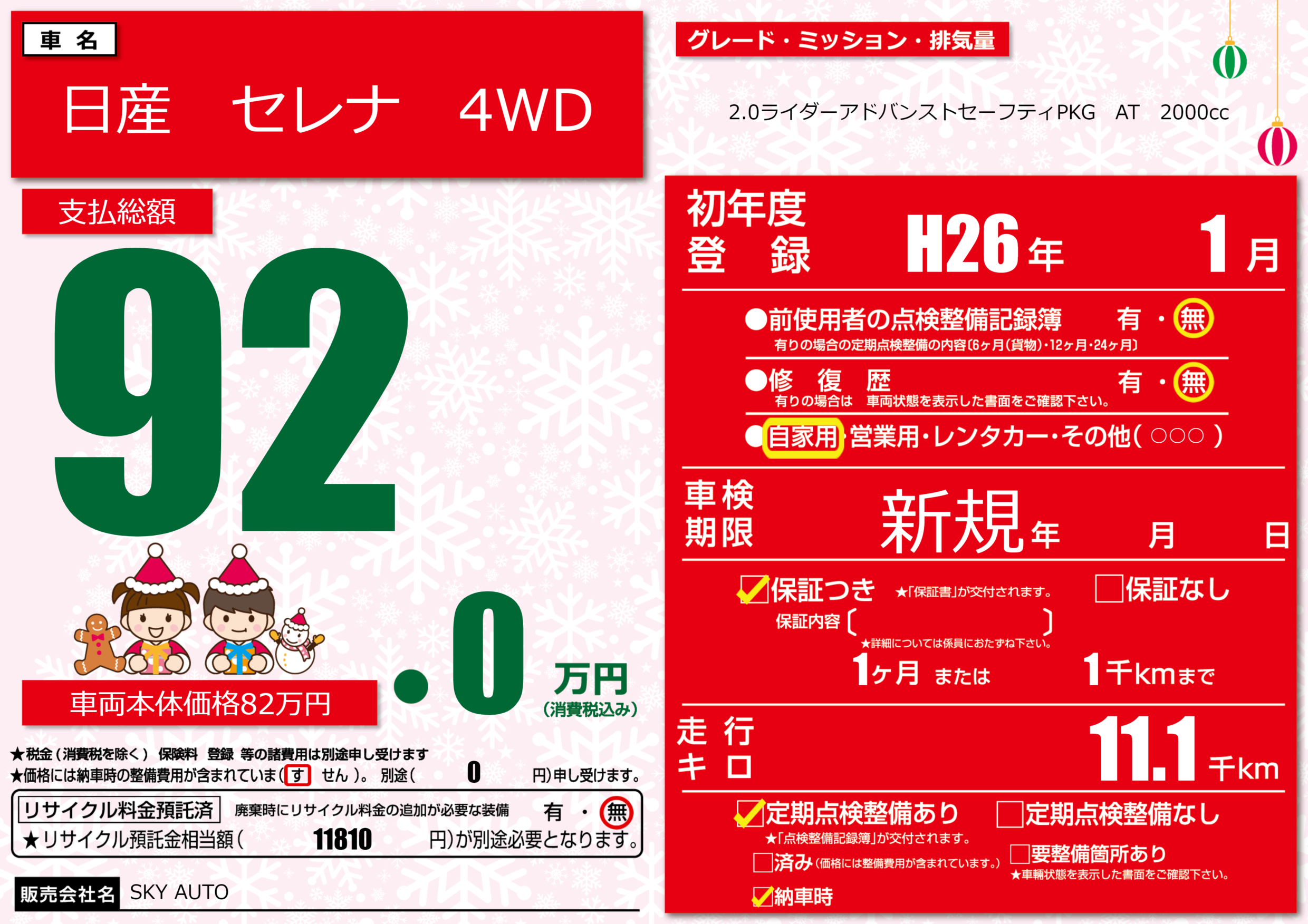 | 車名 | 日産 セレナ 4WD | グレード ミッション 排気量 |