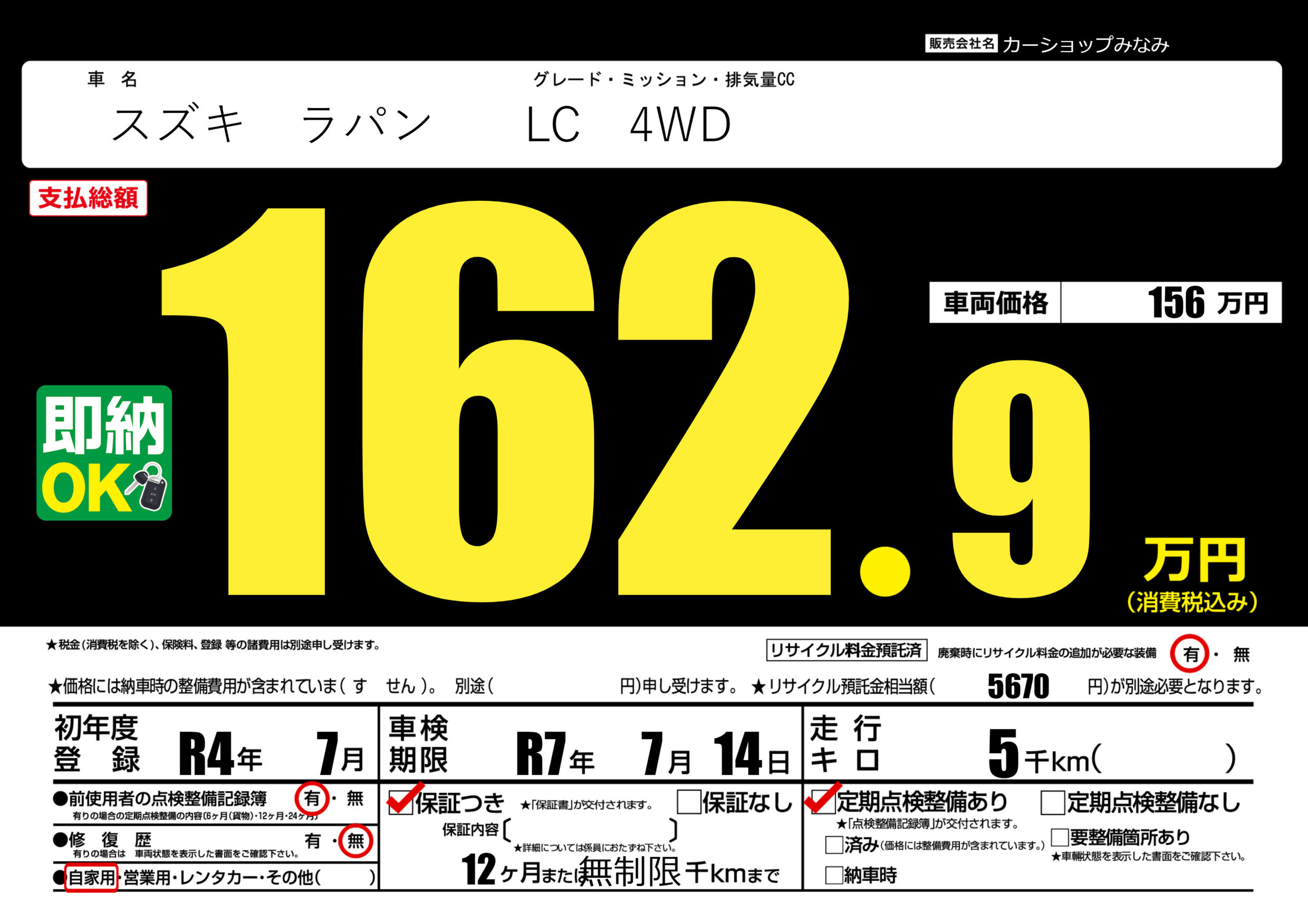 | 走行キロ | 0.5万km | 初年度登録 | R4年7月 |