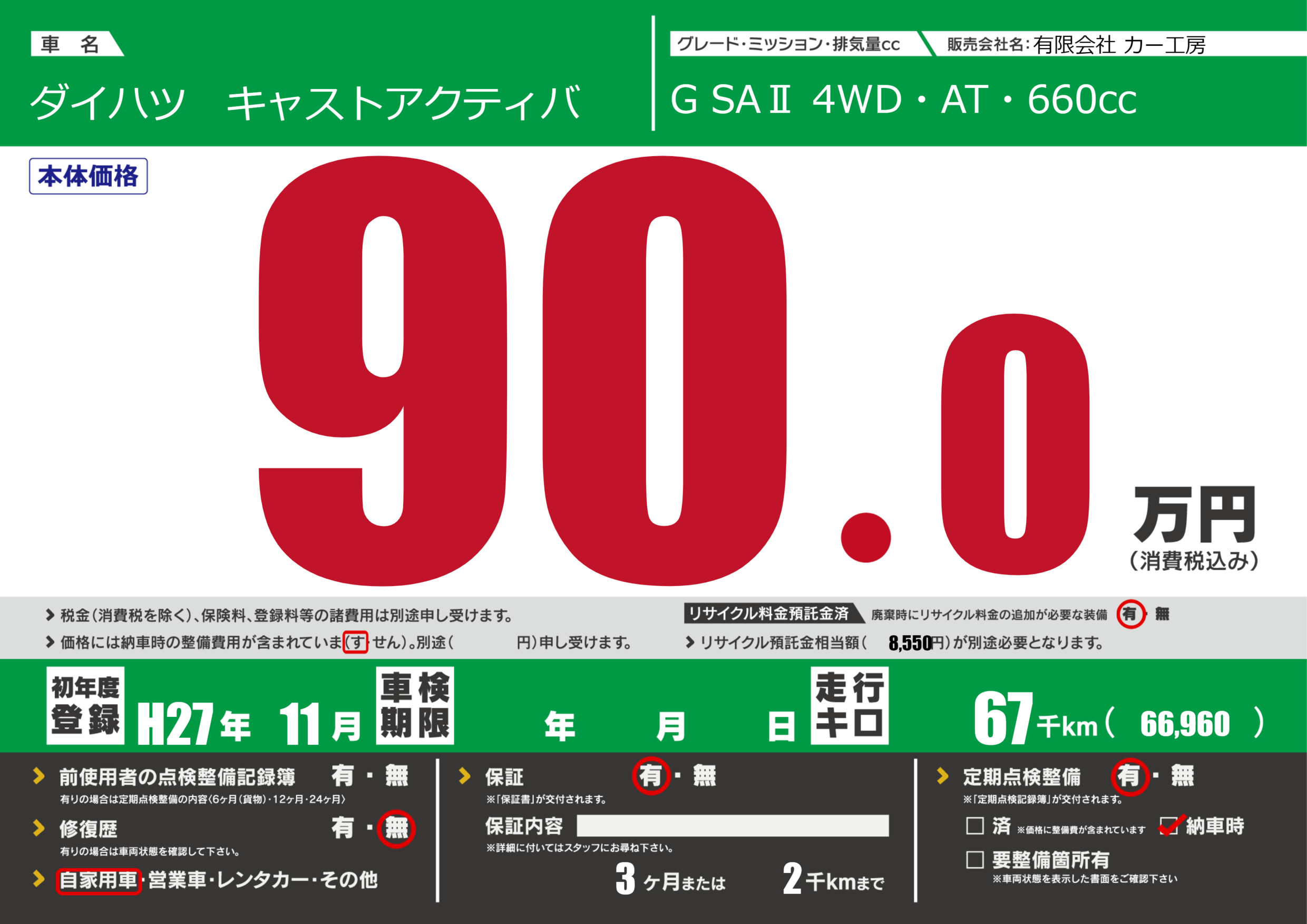 | 車名 | ダイハツ キャストアクティバ | グレード ミッション 排気量 |