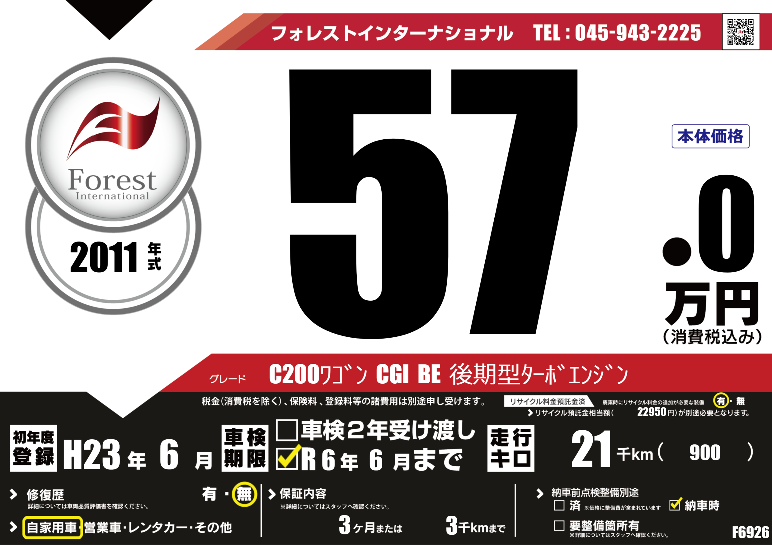 | 走行キロ | 2.1万km | 初年度登録 | H23年6月 |