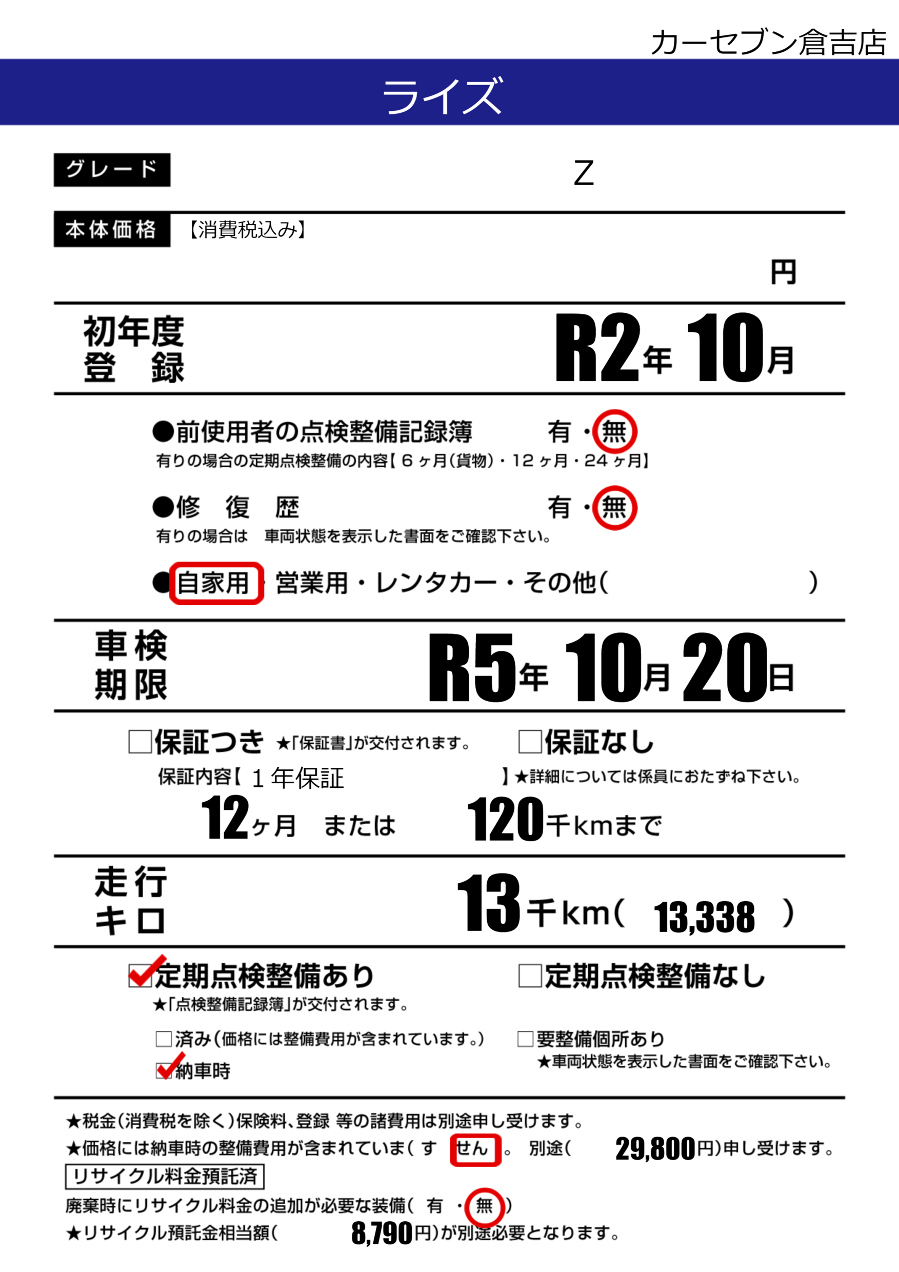 | 定期点検整備 | 定期点検整備あり 納車時あり | ||