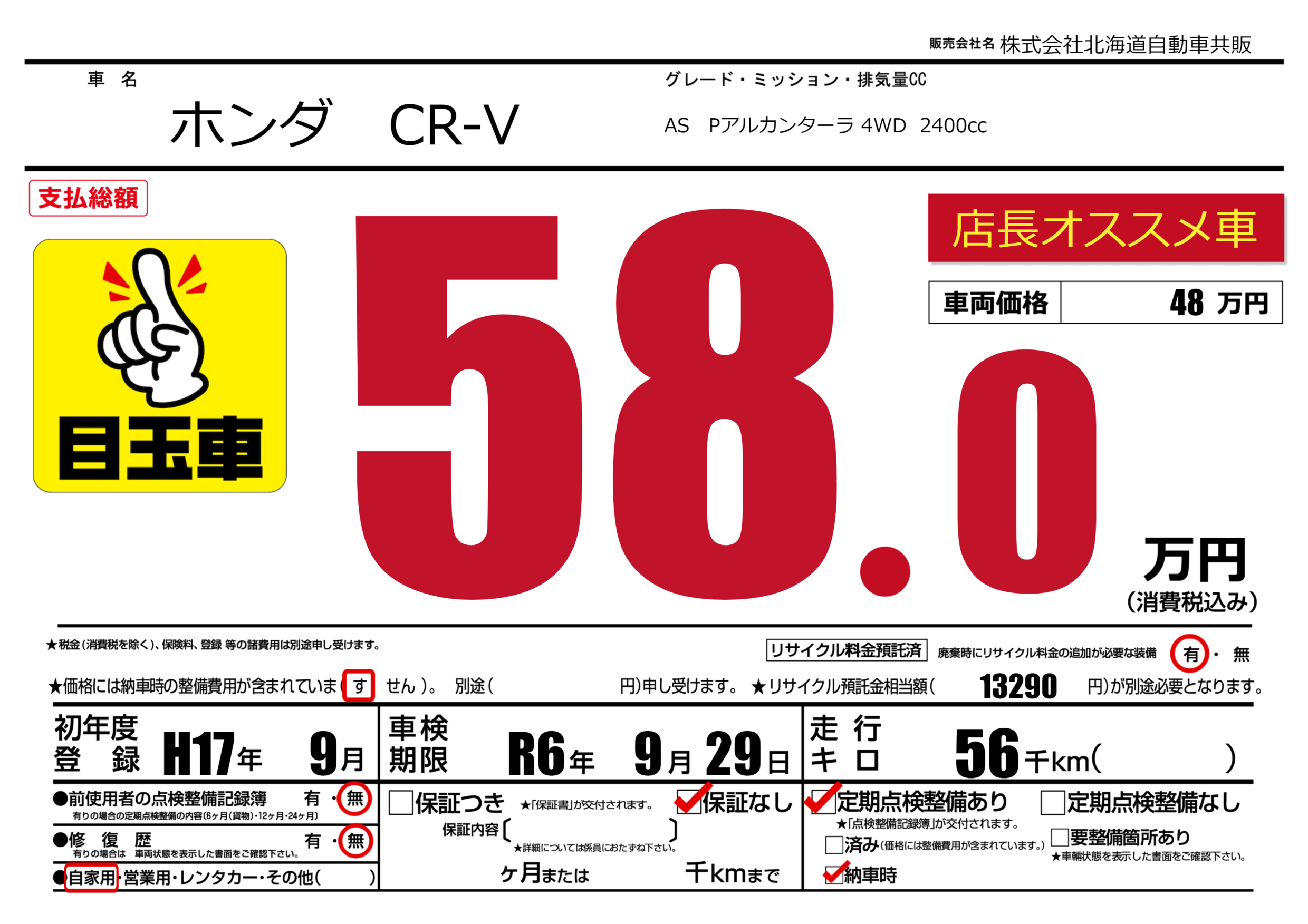 | 走行キロ | 5.6万km | 初年度登録 | H17年9月 |