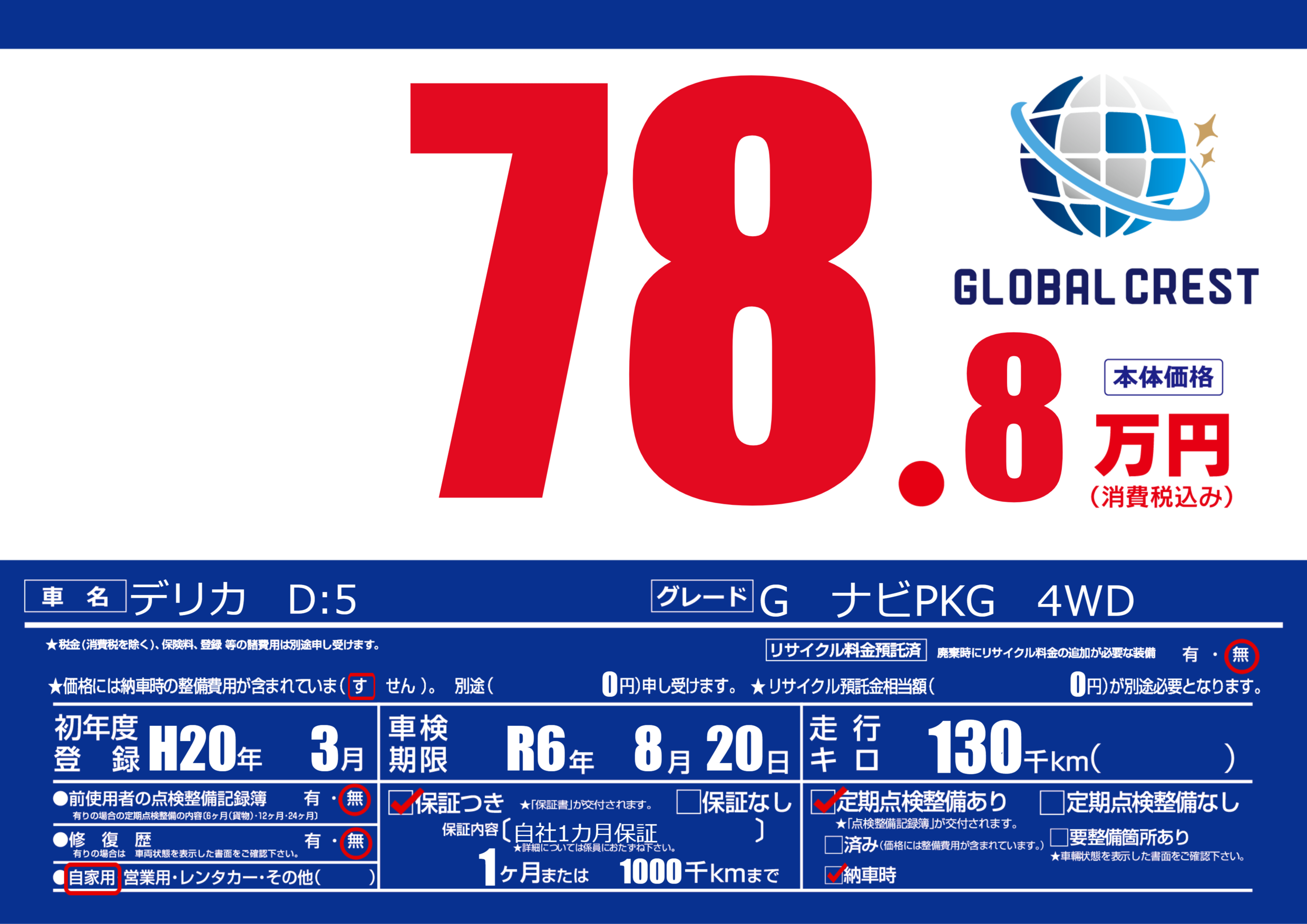 | 車名 | デリカ D:5 | グレード ミッション 排気量 |