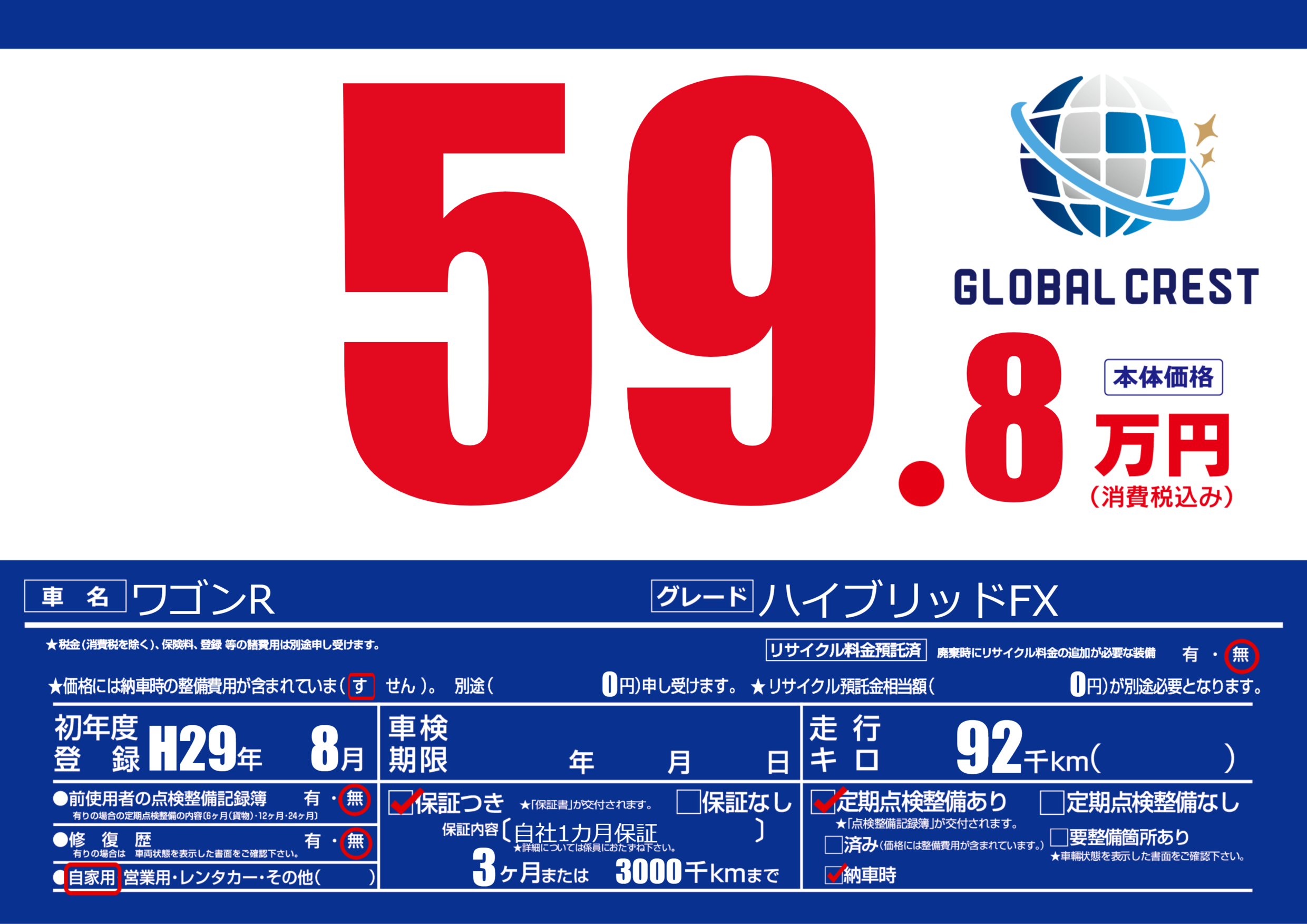 | 車名 | ワゴンR | グレード ミッション 排気量 |