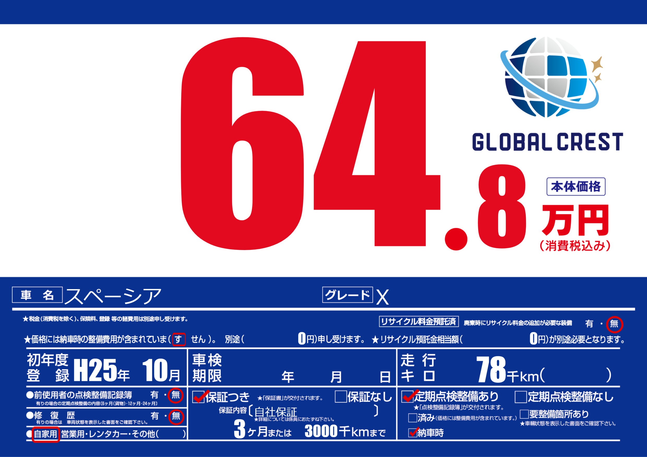 | 走行キロ | 7.8万km | 初年度登録 | H25年10月 |