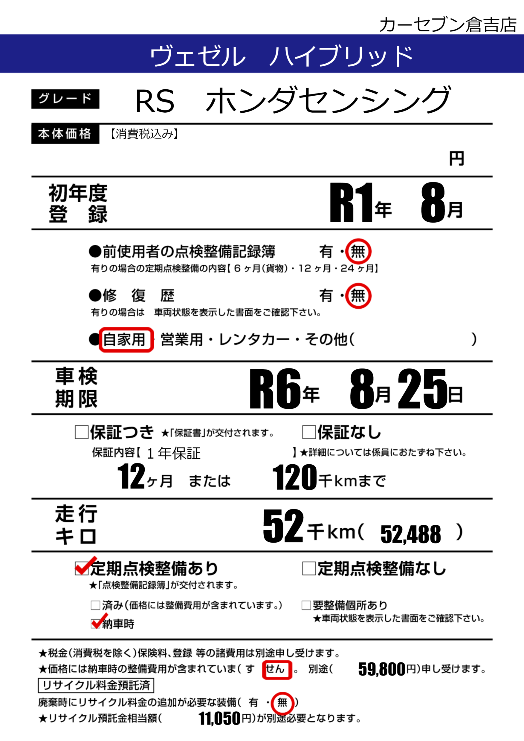 | 車名 | ヴェゼル ハイブリッド | グレード ミッション 排気量 |