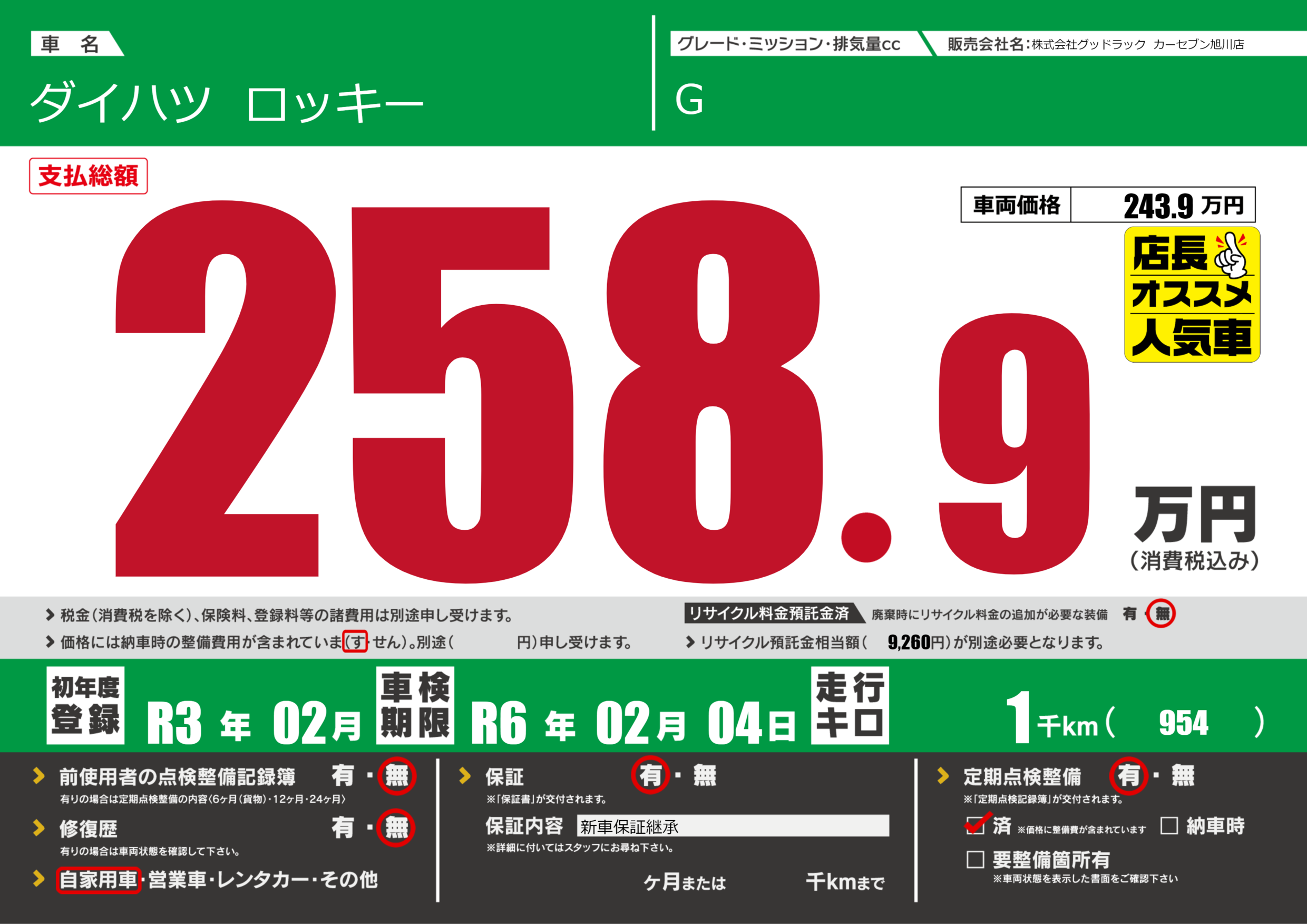 | 車名 | ダイハツ ロッキー | グレード ミッション 排気量 |
