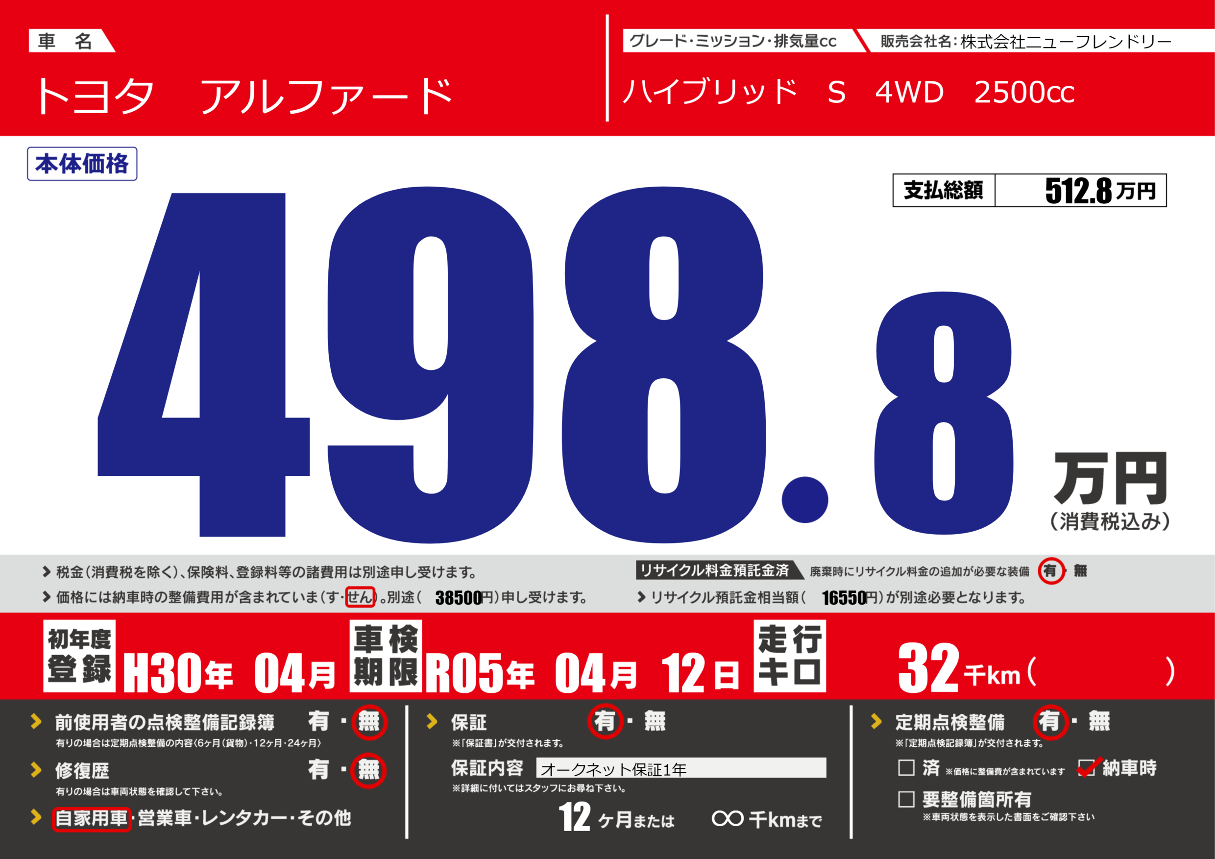 | 車名 | トヨタ アルファード | グレード ミッション 排気量 |