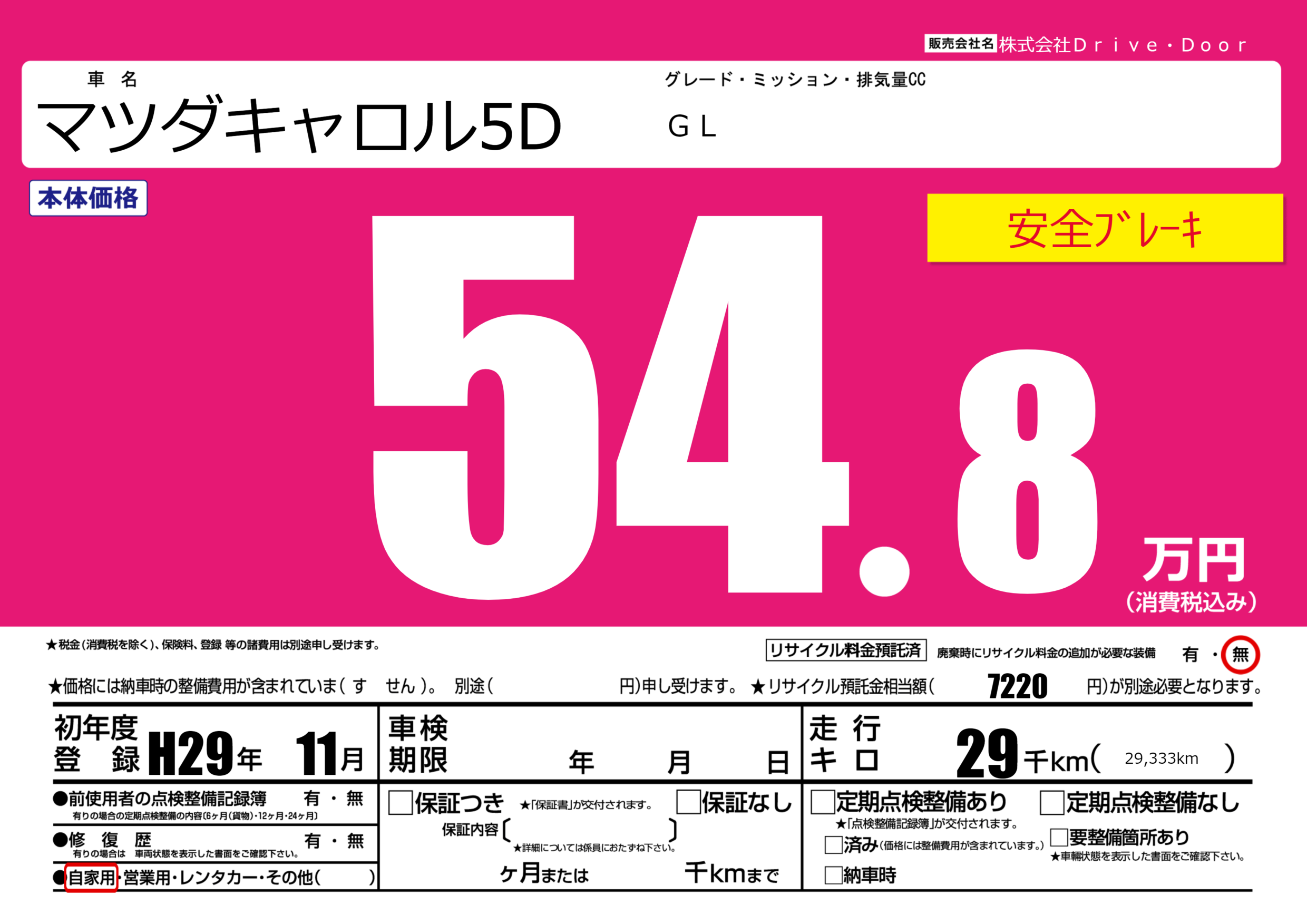 | 走行キロ | 2.9万km | 初年度登録 | H29年11月 |