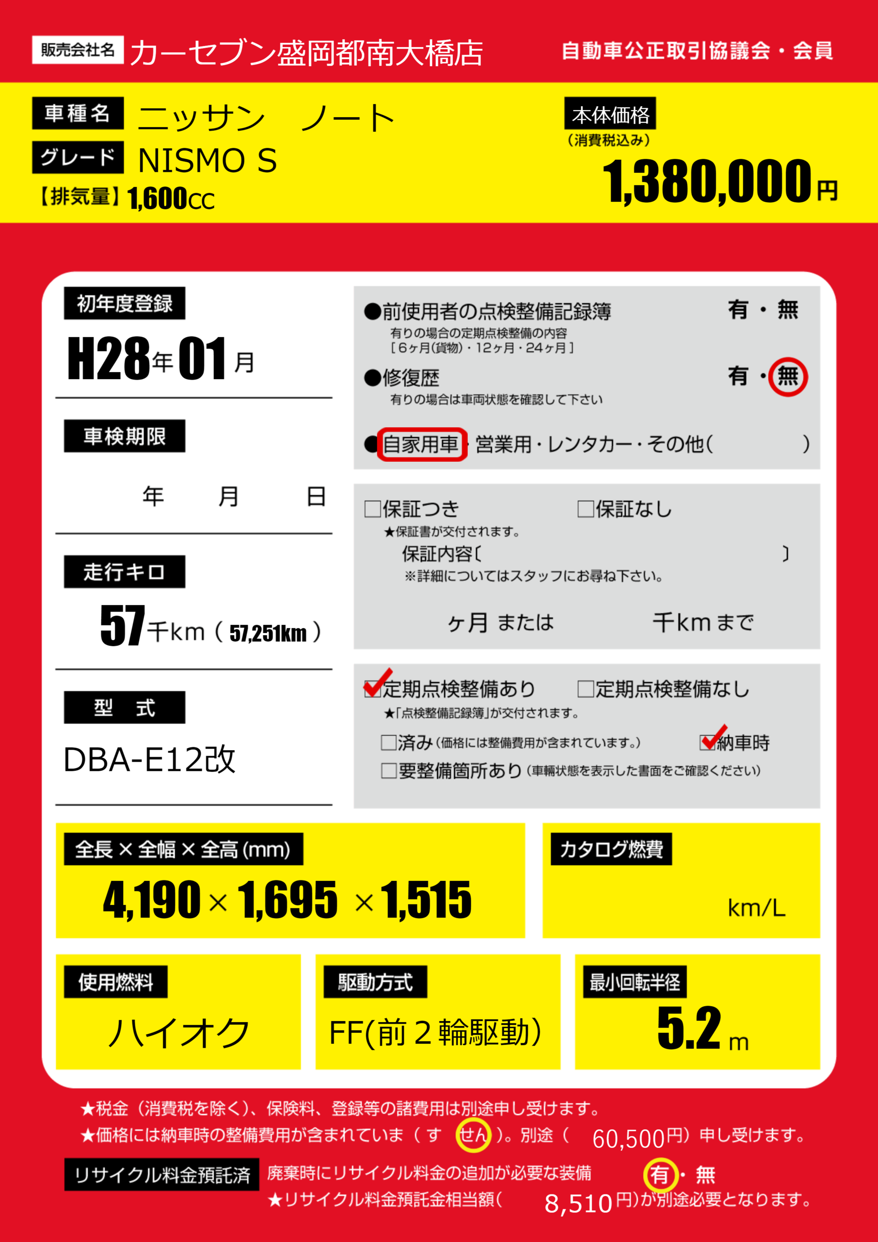 | 車名 | ニッサン ノート | グレード ミッション 排気量 |
