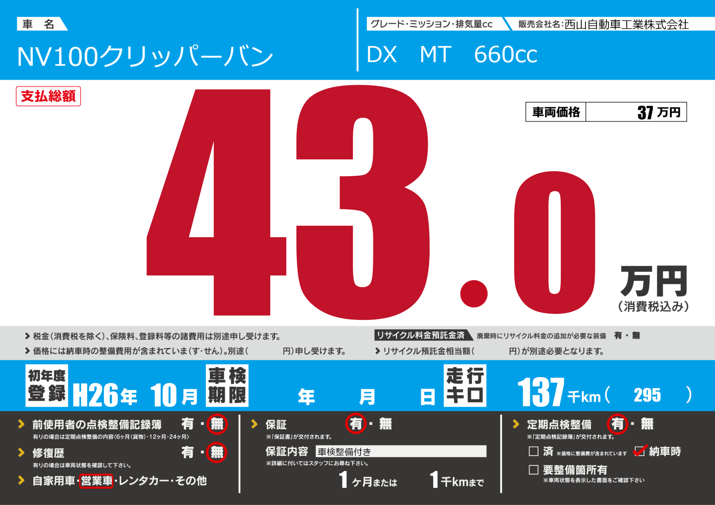 | 車名 | NV100クリッパーバン | グレード ミッション 排気量 |
