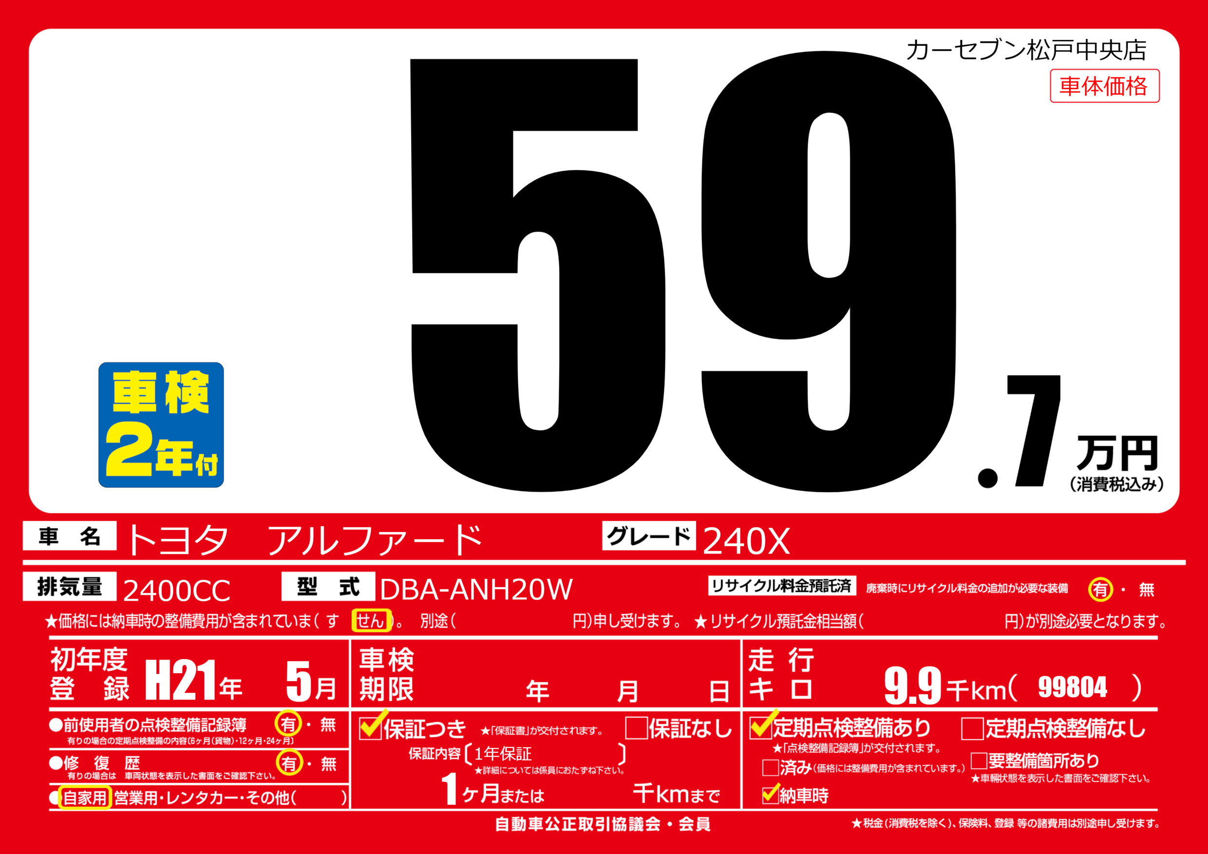 | 車名 | トヨタ アルファード | グレード ミッション 排気量 |