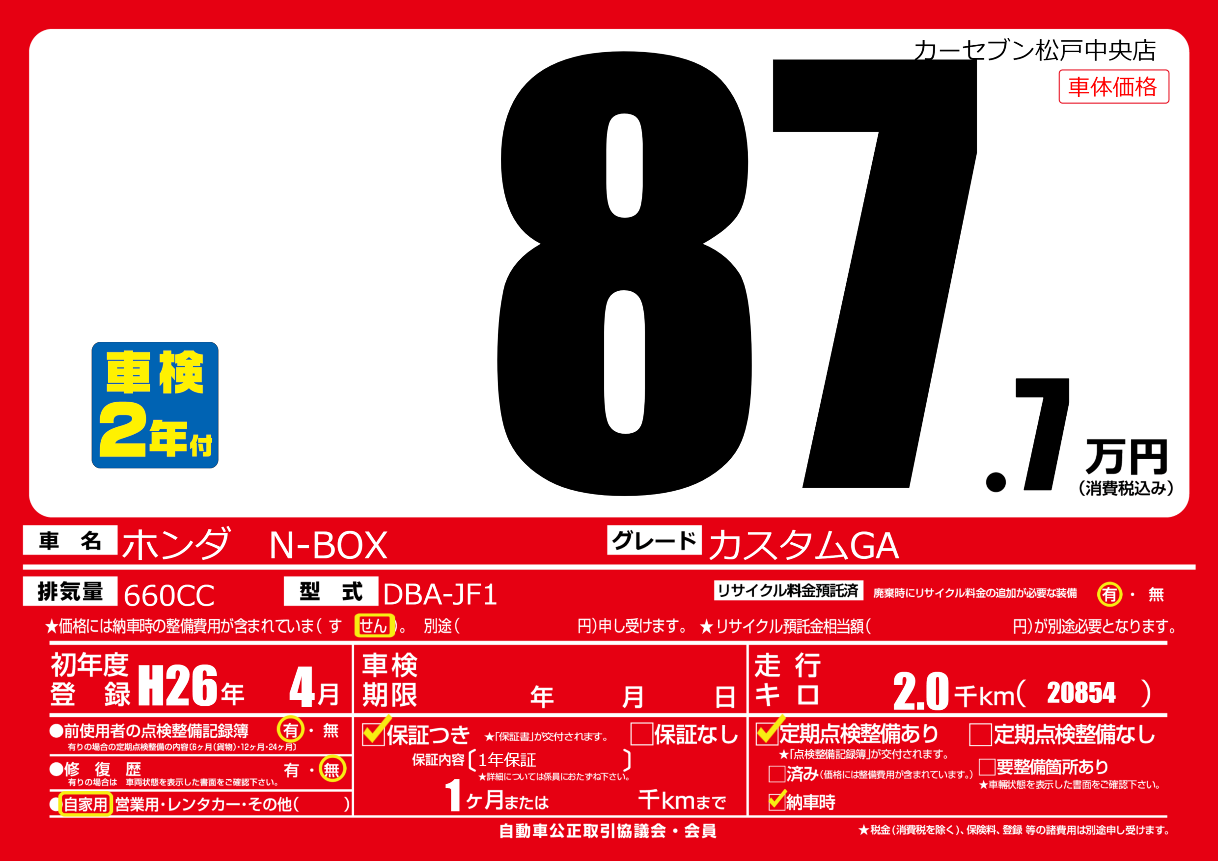 | 車名 | ホンダ N-BOX | グレード ミッション 排気量 |