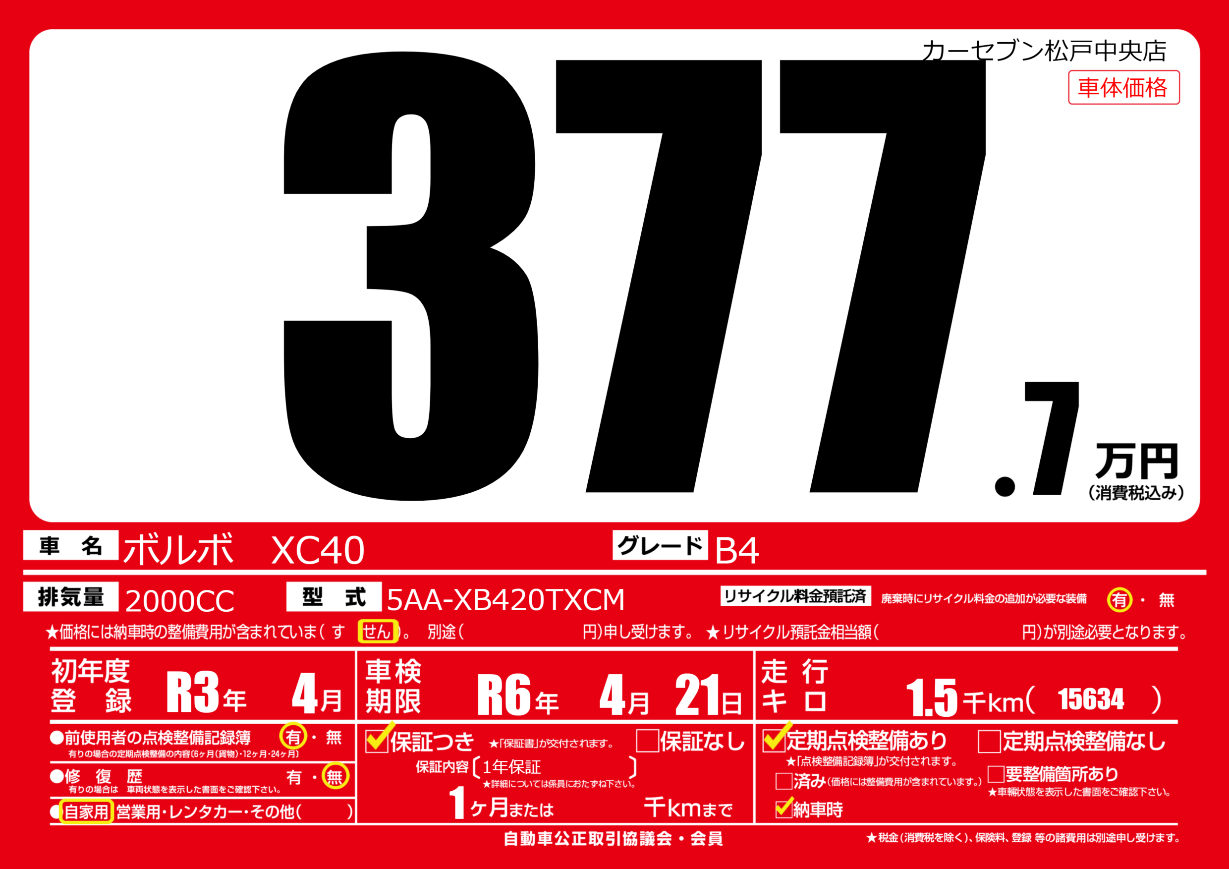 | 車名 | ボルボ XC40 | グレード ミッション 排気量 |