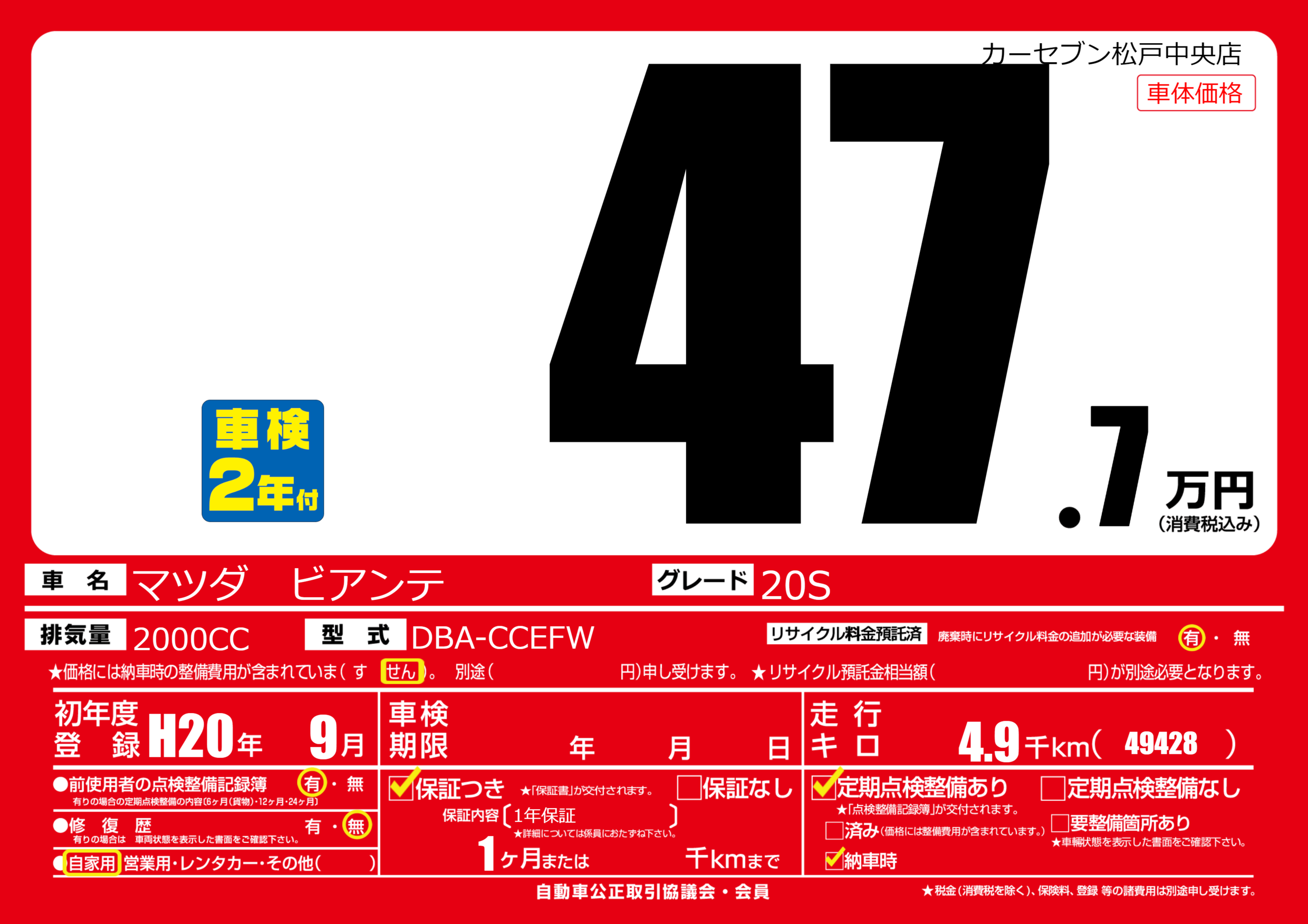 | 車名 | マツダ ビアンテ | グレード ミッション 排気量 |