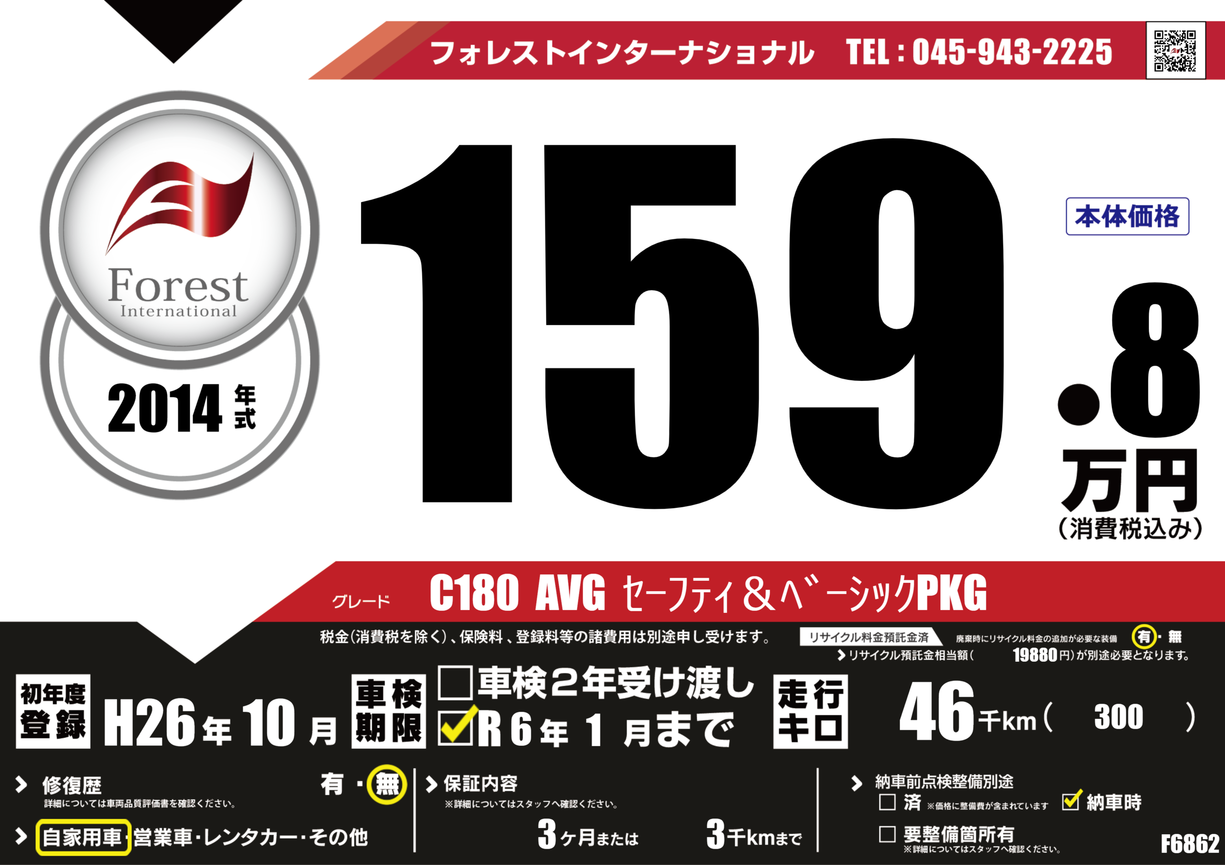 | 走行キロ | 4.6万km | 初年度登録 | H26年10月 |