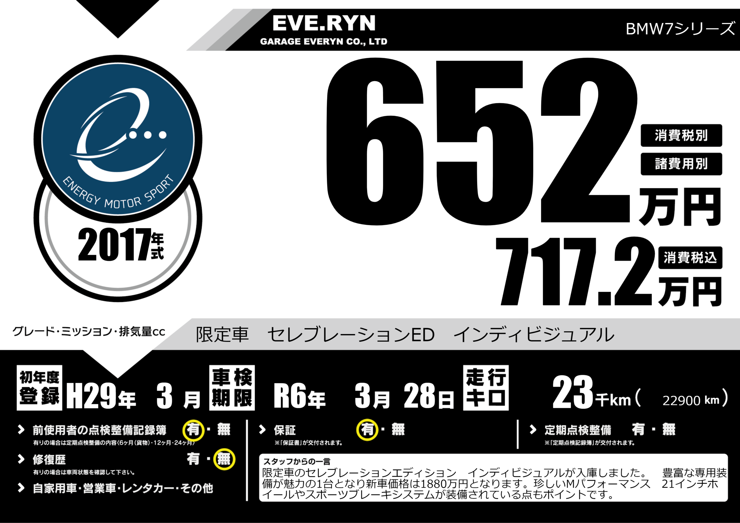 | 車名 | BMW7シリーズ | グレード ミッション 排気量 |