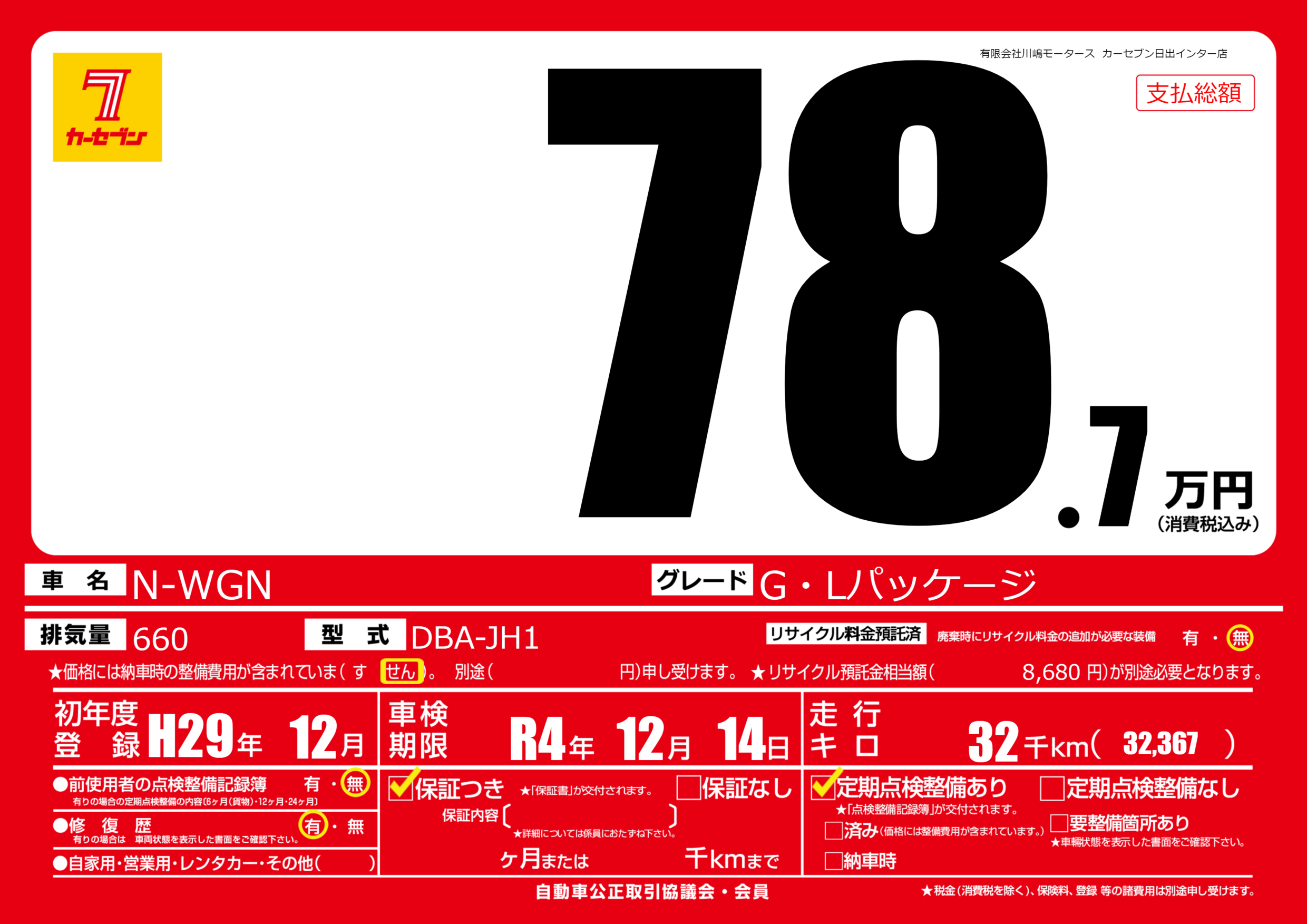 | 車名 | N-WGN | グレード ミッション 排気量 |