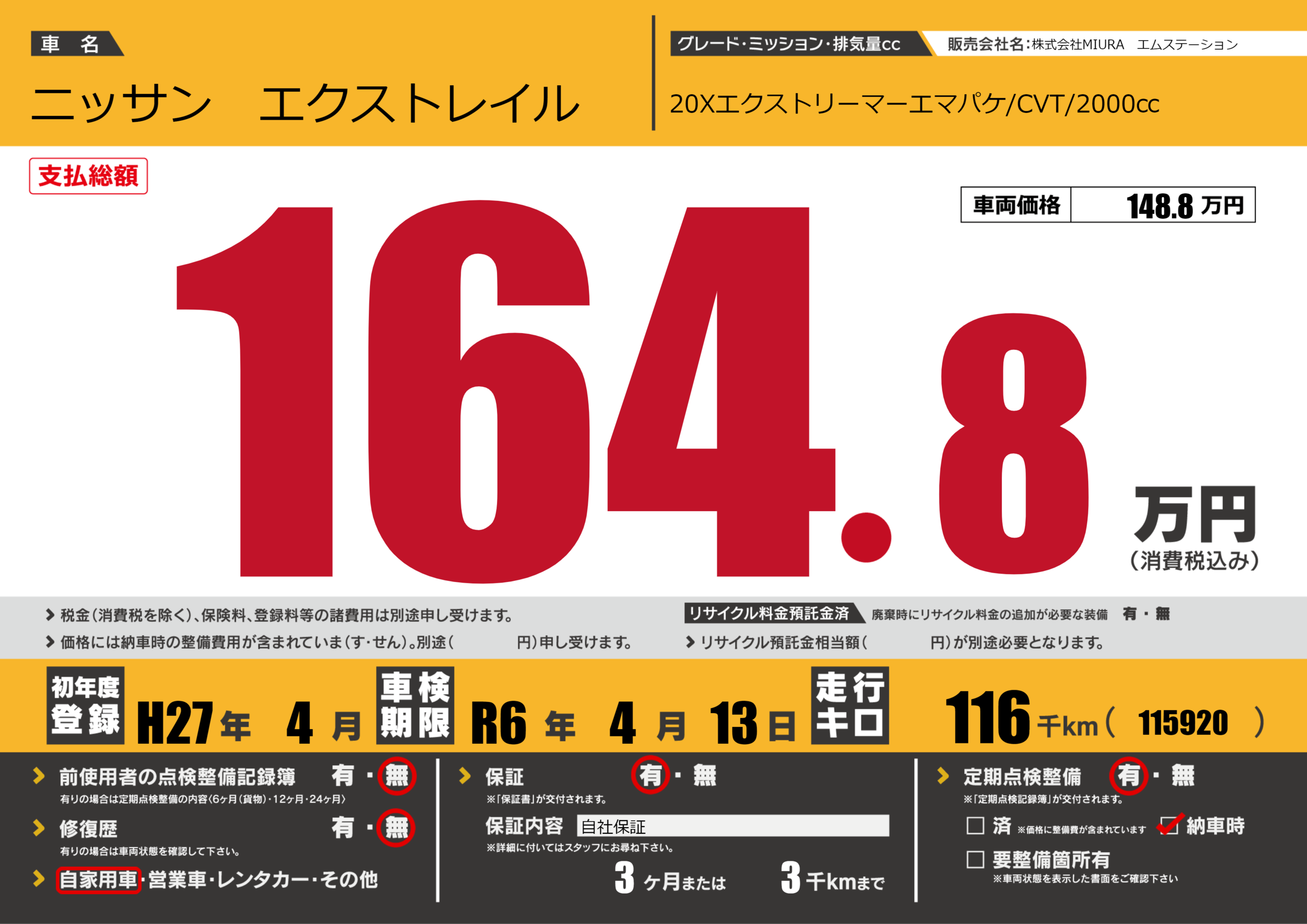 保証付き 保証内容(自社保証) 3ヶ月または3千km |