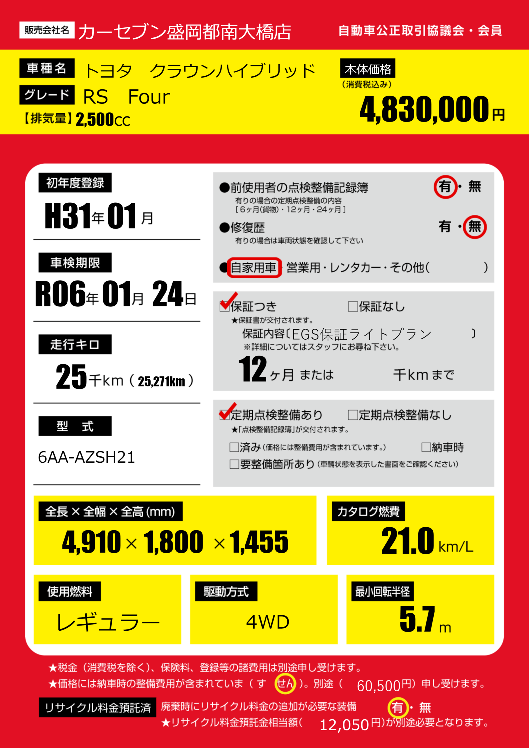 | 車名 | トヨタ クラウンハイブリッド | グレード ミッション 排気量 |