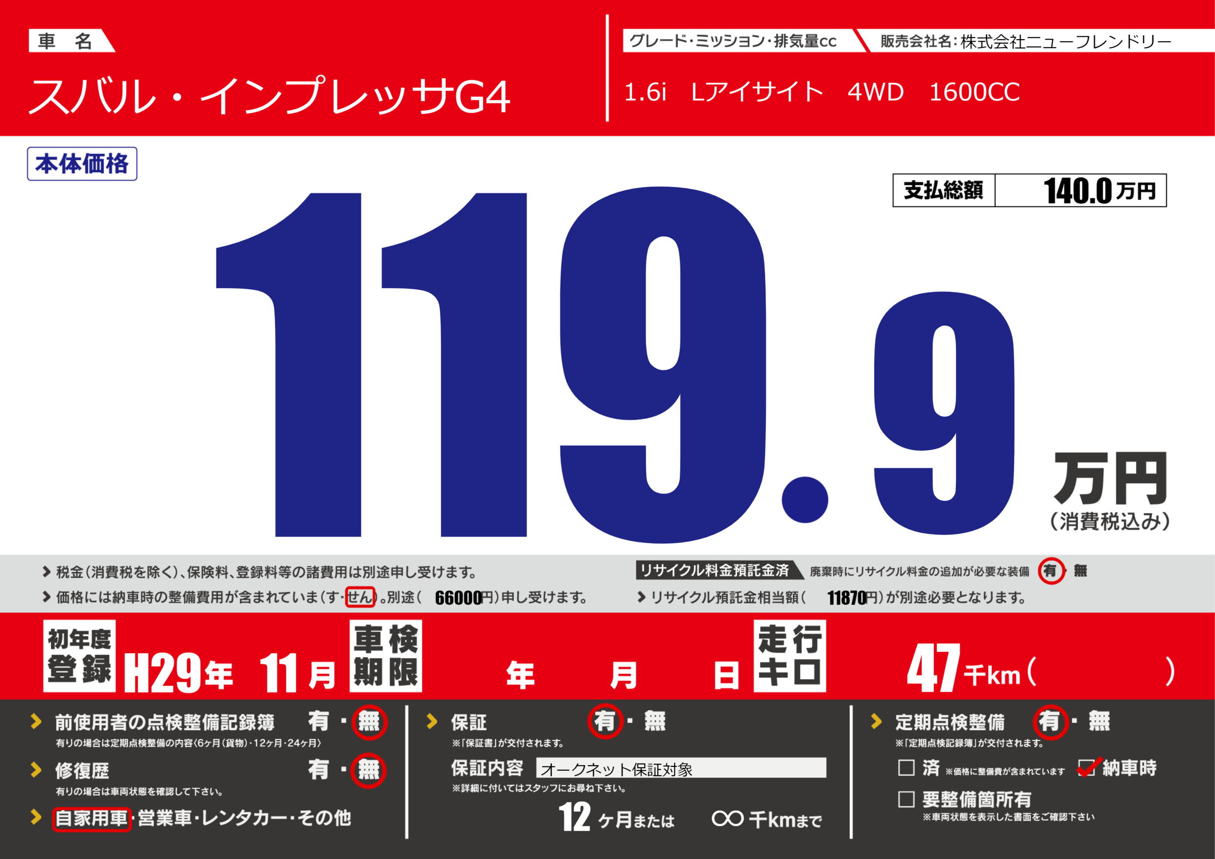 | 車名 | スバル・インプレッサG4 | グレード ミッション 排気量 |