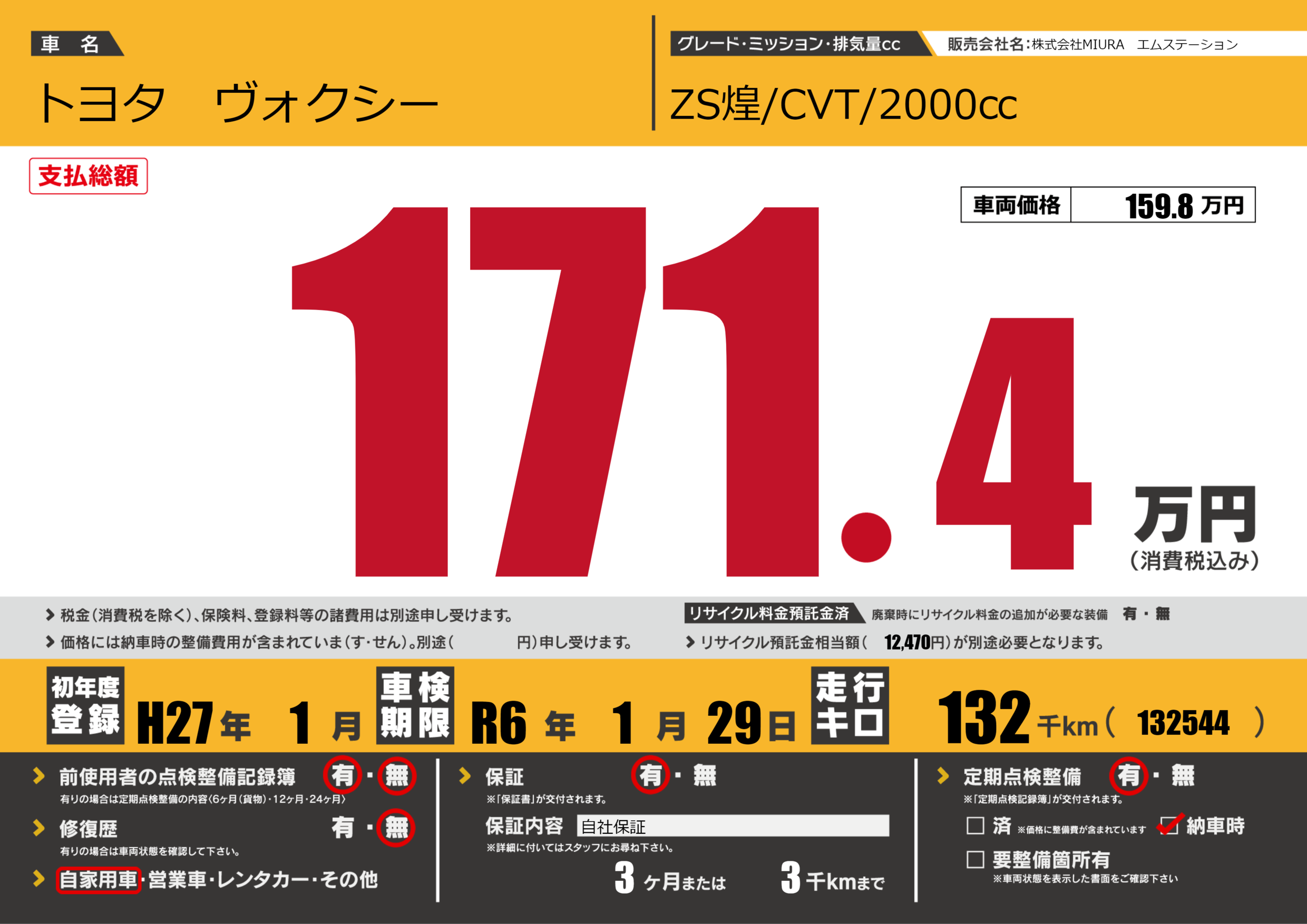 | 走行キロ | 13.2万km | 初年度登録 | H27年1月 |