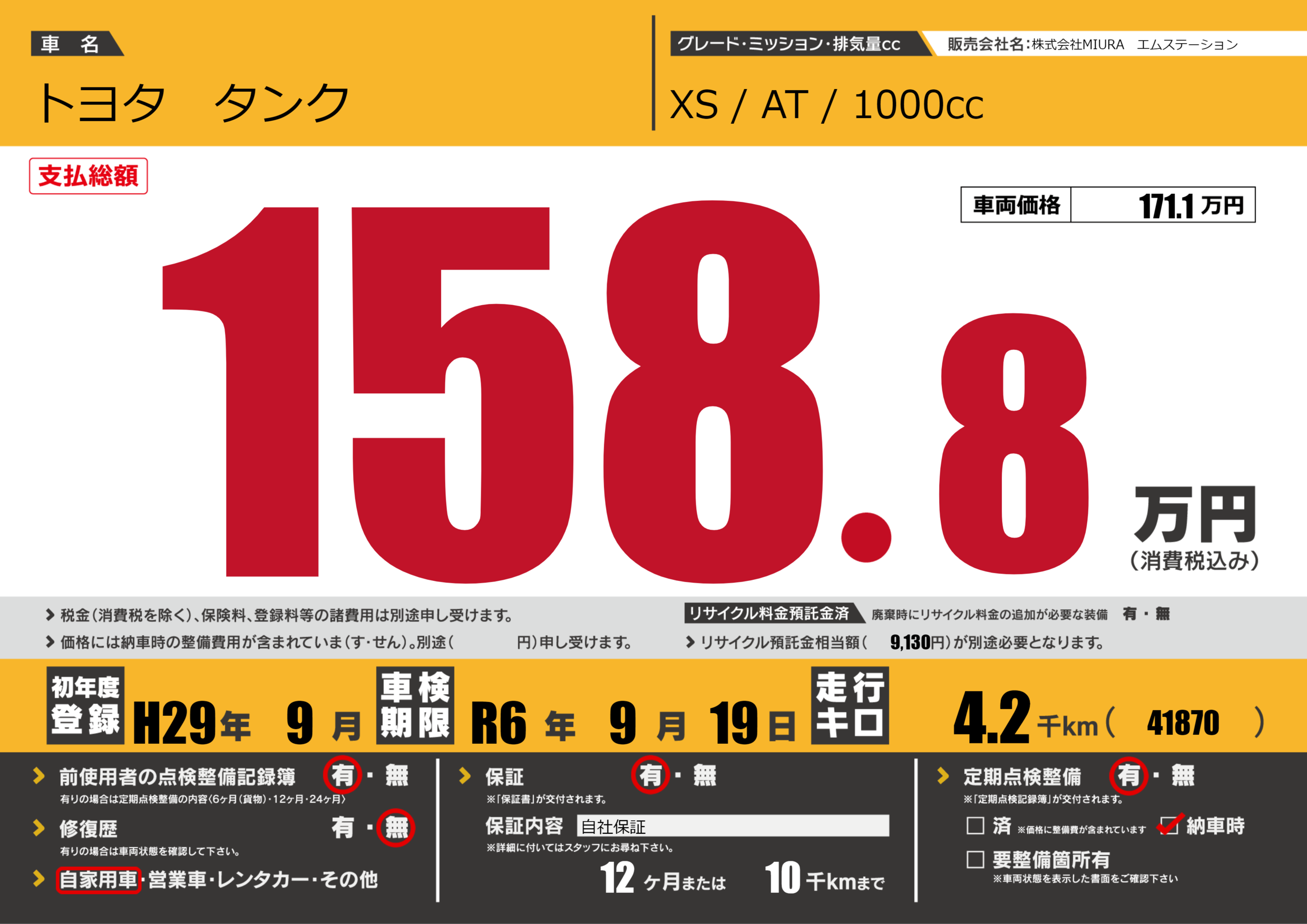 | 車検制限 | R6年 9月 19日 | ||