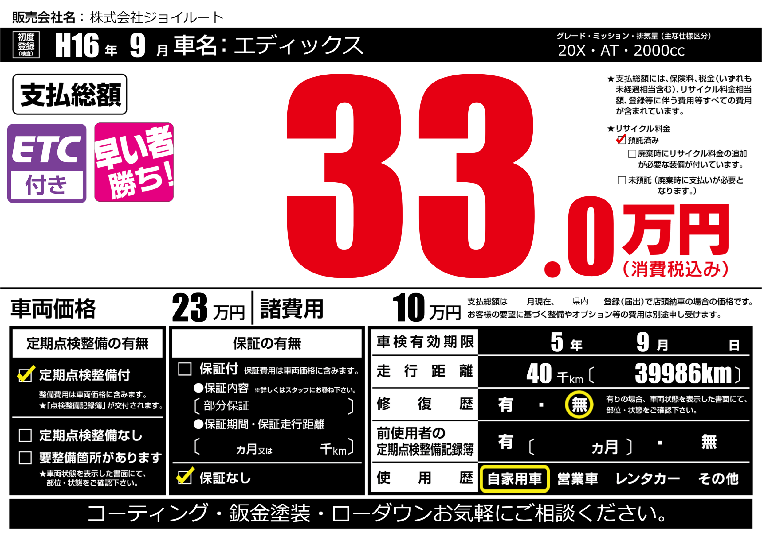 | 車名 | エディックス | グレード ミッション 排気量 |