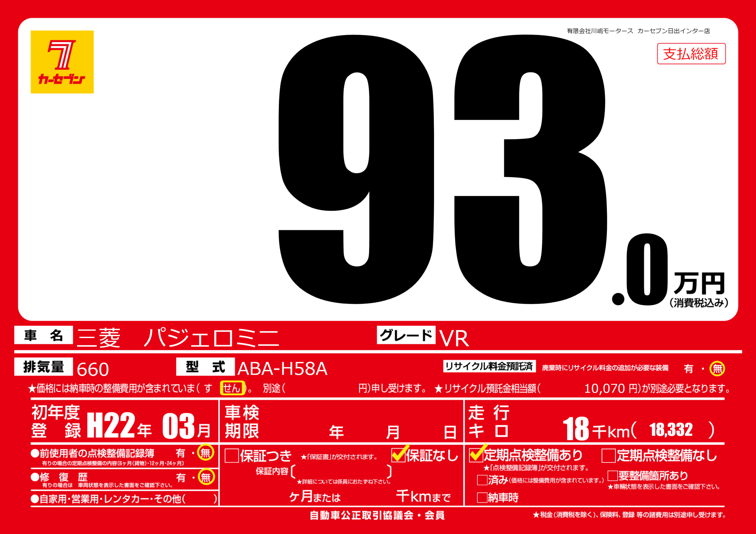 | 車名 | 三菱 パジェロミニ | グレード ミッション 排気量 |