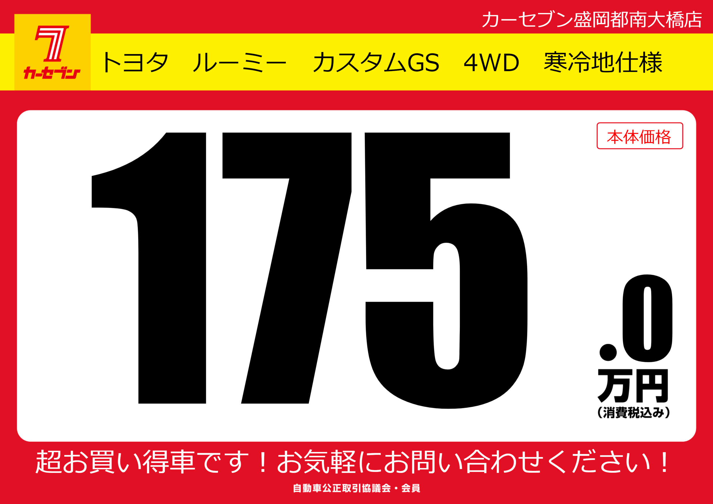 | 車名 | トヨタ ルーミー カスタムGS 4WD 寒冷地仕様 | グレード ミッション 排気量 |
