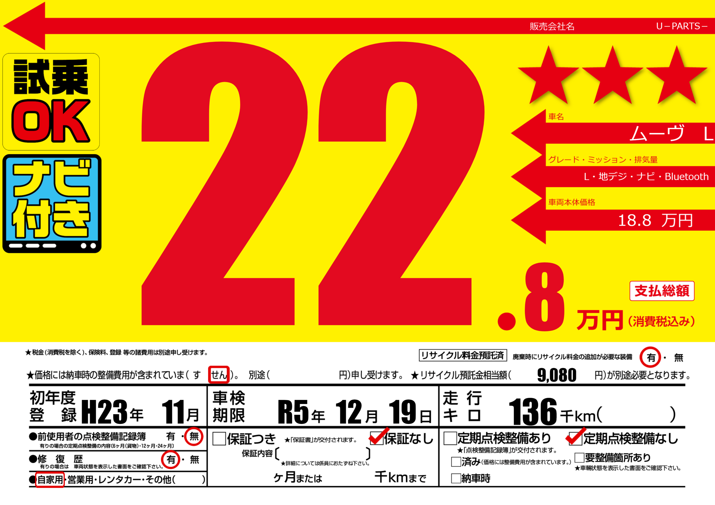 | 車名 | ムーヴ L | グレード ミッション 排気量 |