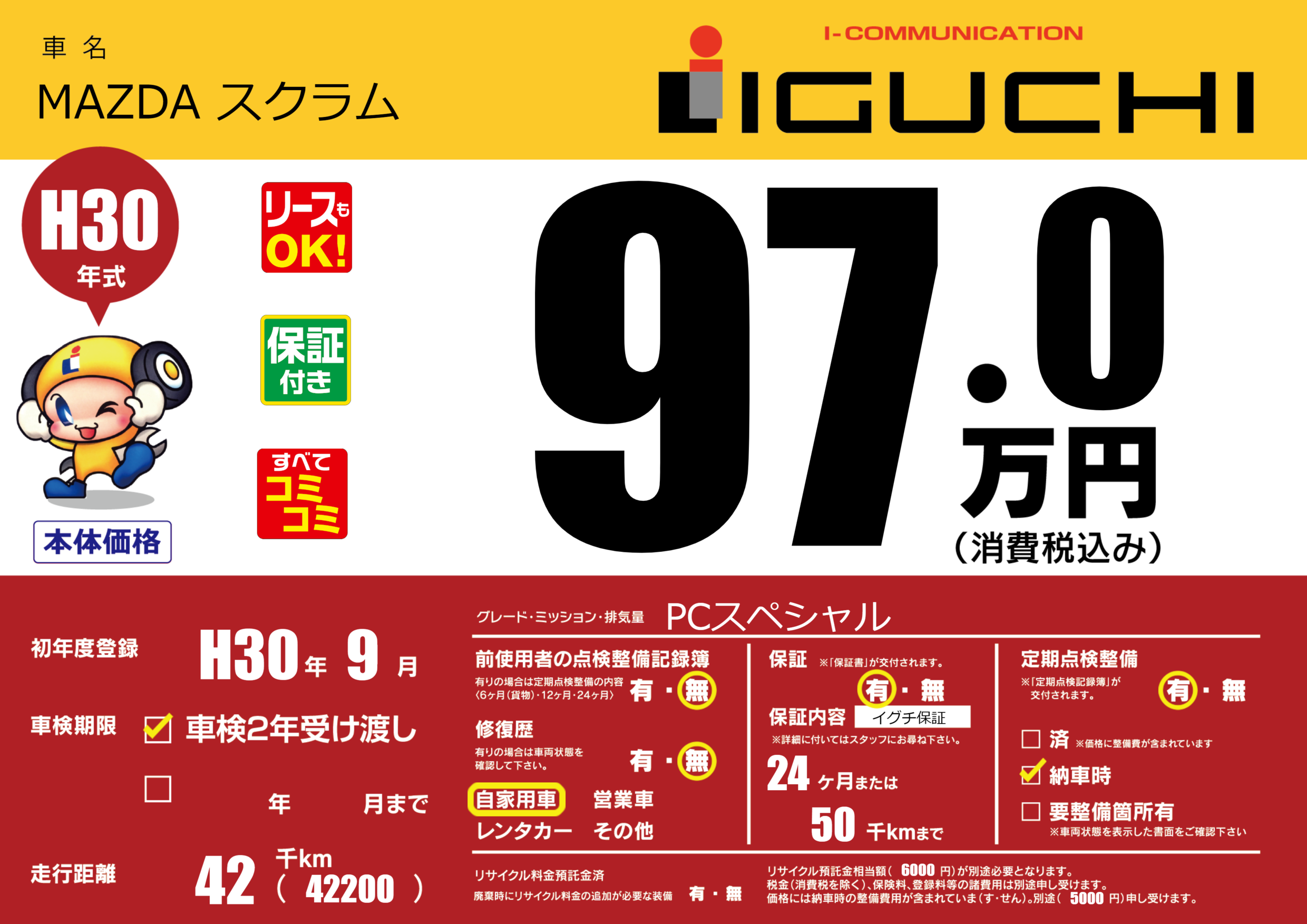保証付き 保証内容(イグチ保証) 24ヶ月または(50)千kmまで |