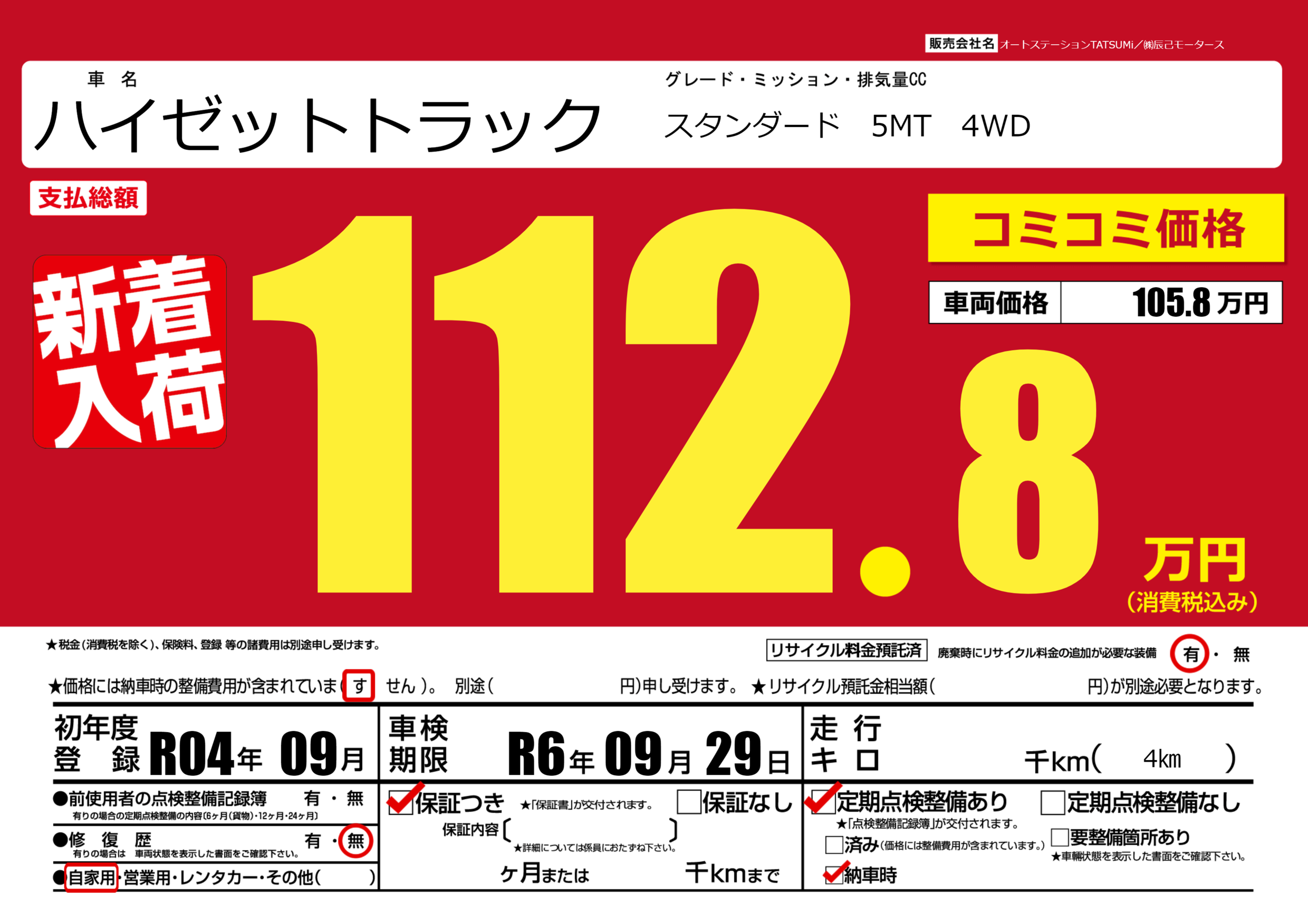 | 車名 | ハイゼットトラック | グレード ミッション 排気量 |
