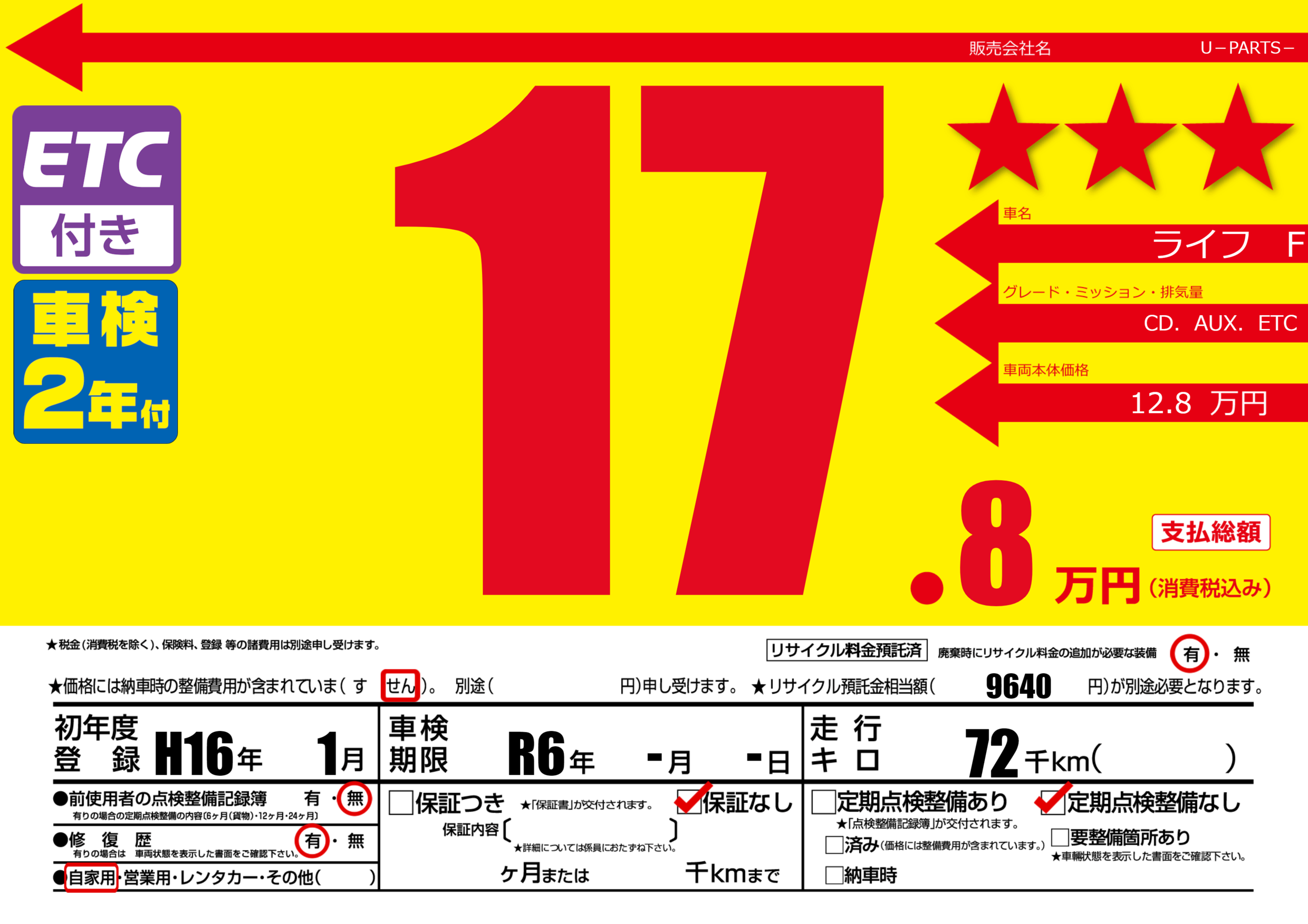 | 車名 | ライフ F | グレード ミッション 排気量 |
