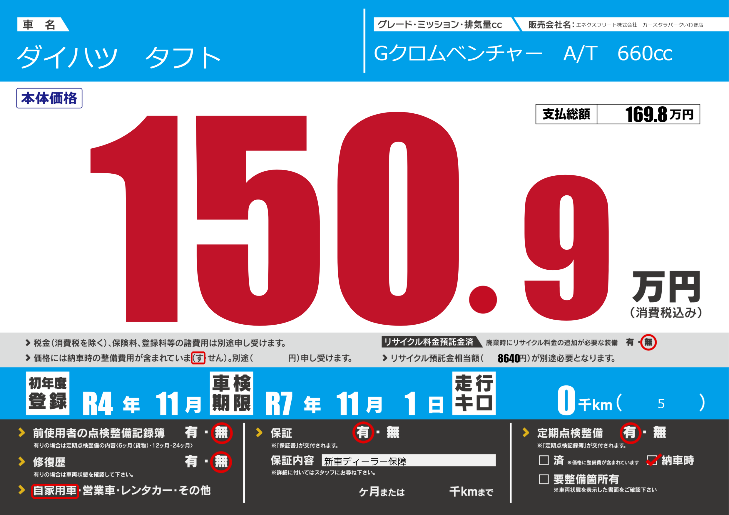 | 定期点検整備 | 定期点検整備あり 納車時あり | ||