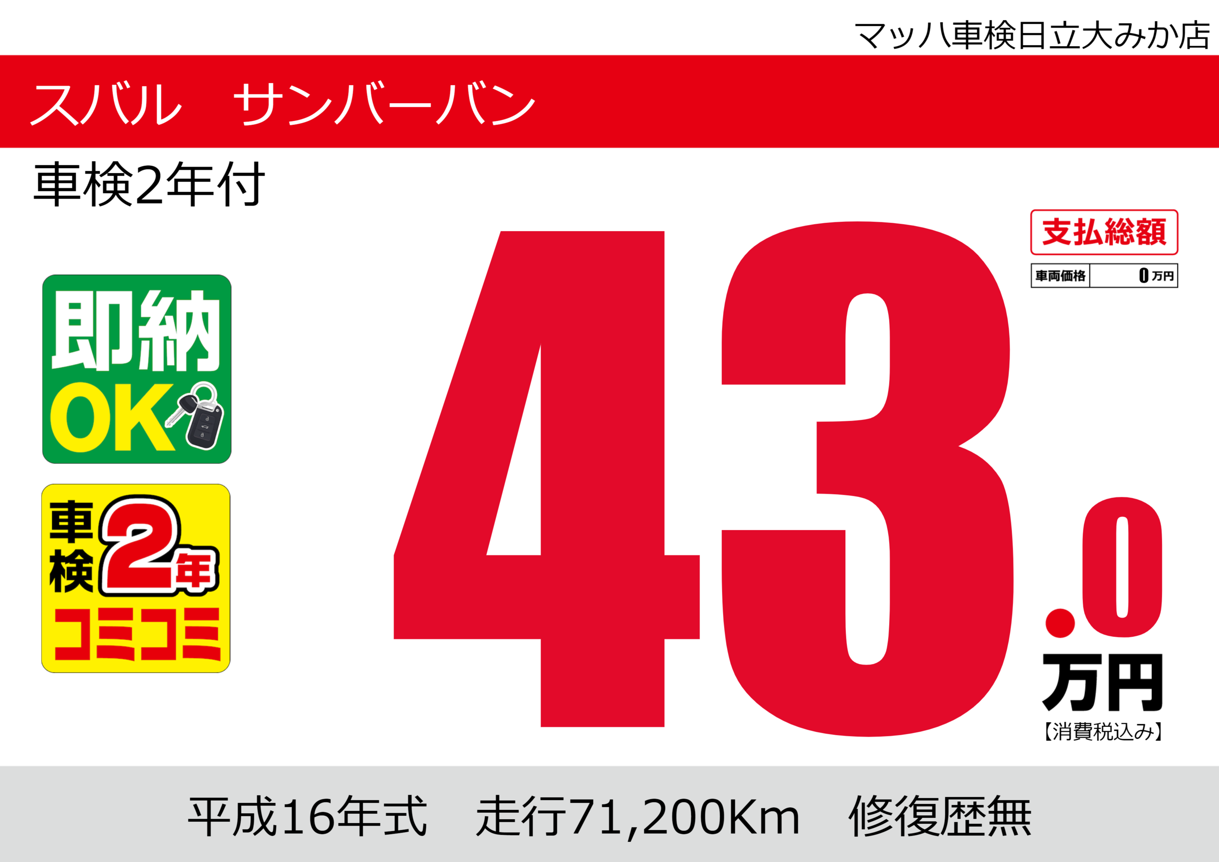 | 車名 | スバル サンバーバン | グレード ミッション 排気量 |