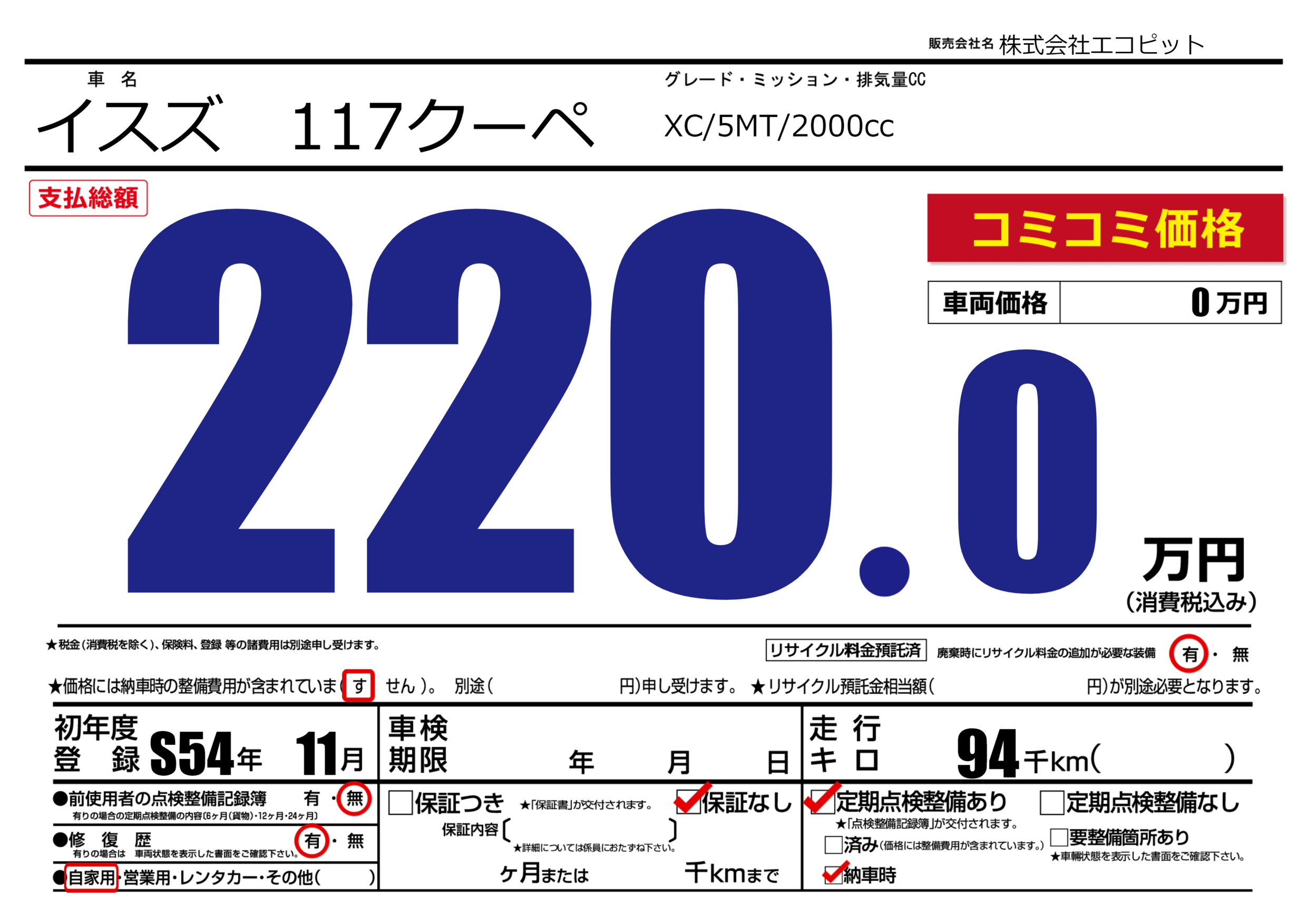 | 車名 | イスズ 117クーペ | グレード ミッション 排気量 |