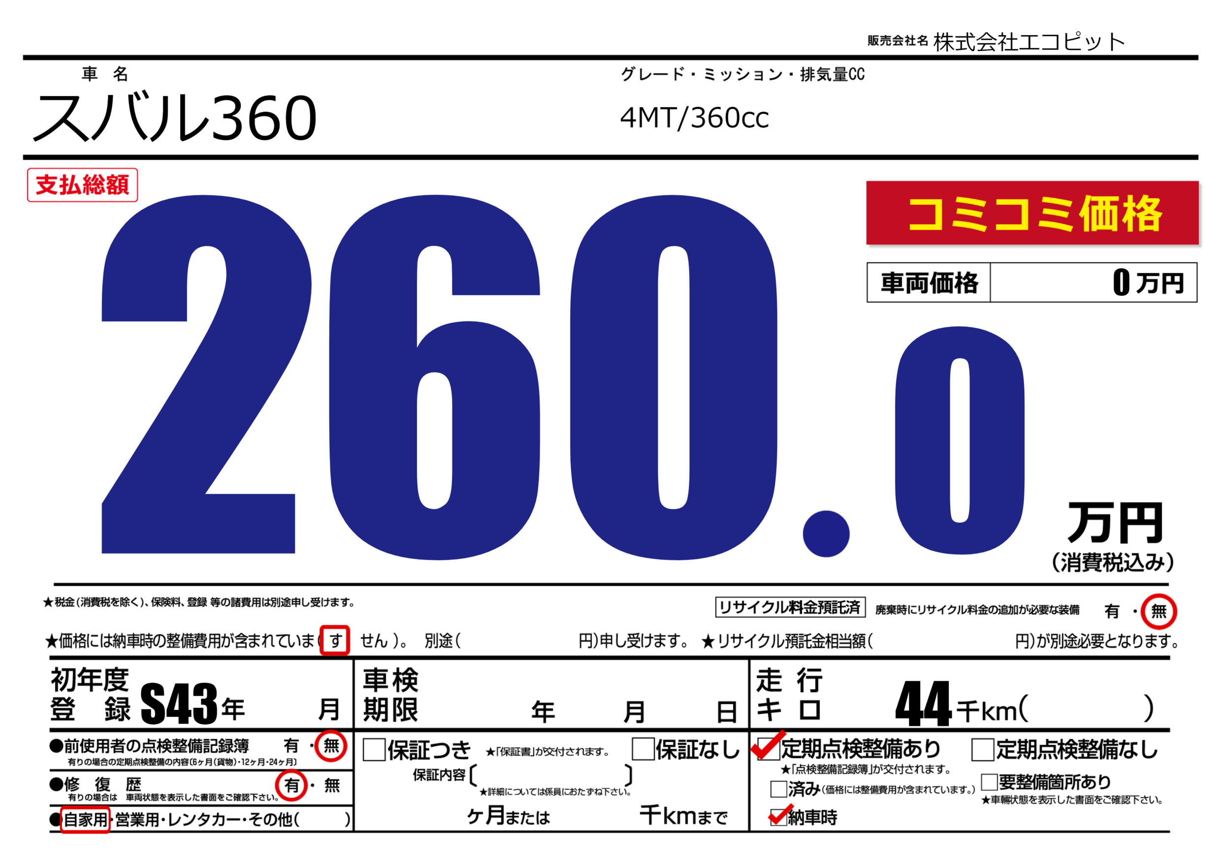 | 車検制限 | - 年 - 月 - 日 | ||