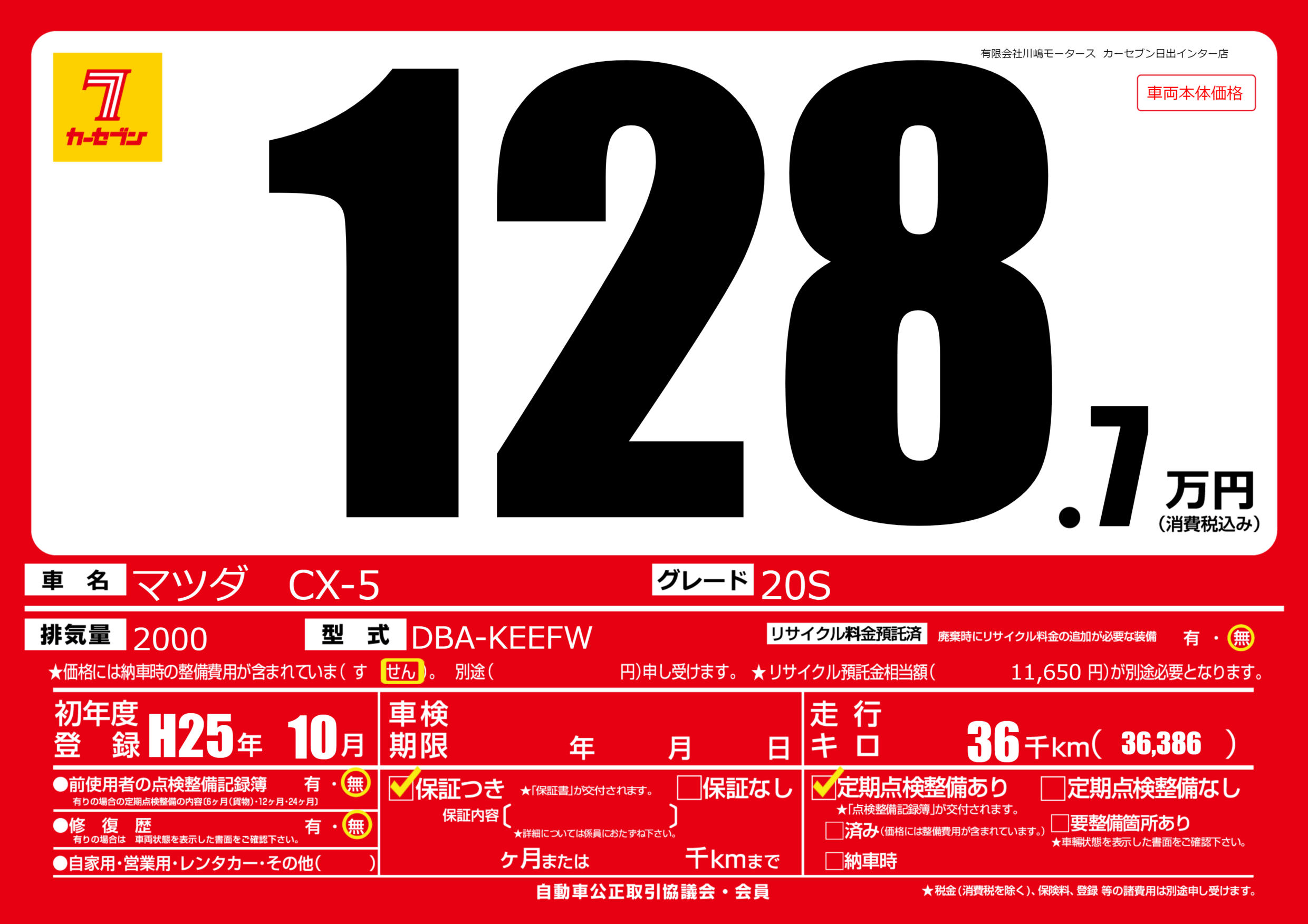 | 車名 | マツダ CX-5 | グレード ミッション 排気量 |