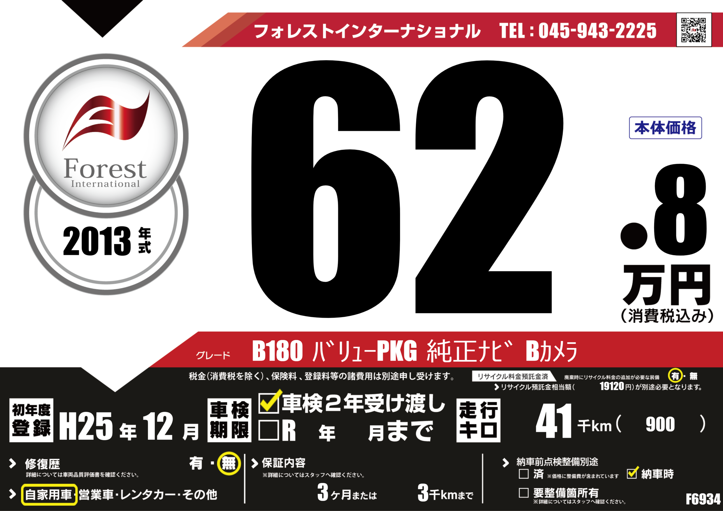 | 走行キロ | 4.1万km | 初年度登録 | H25年12月 |